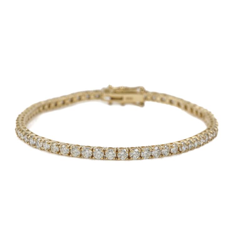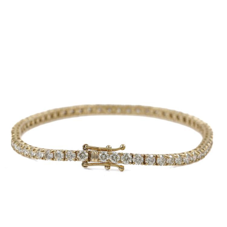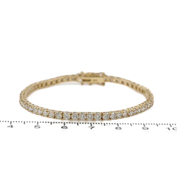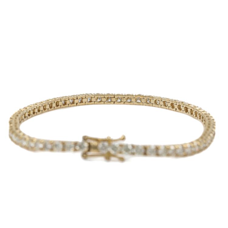 Diamond tennis bracelet with 62 round diamonds totalling 4.98ct (Estimated grading: J-K SI). 18ct yellow gold. Length: 18cm. Weight: 9.8g. With Valuation Certificate #419599. (New)