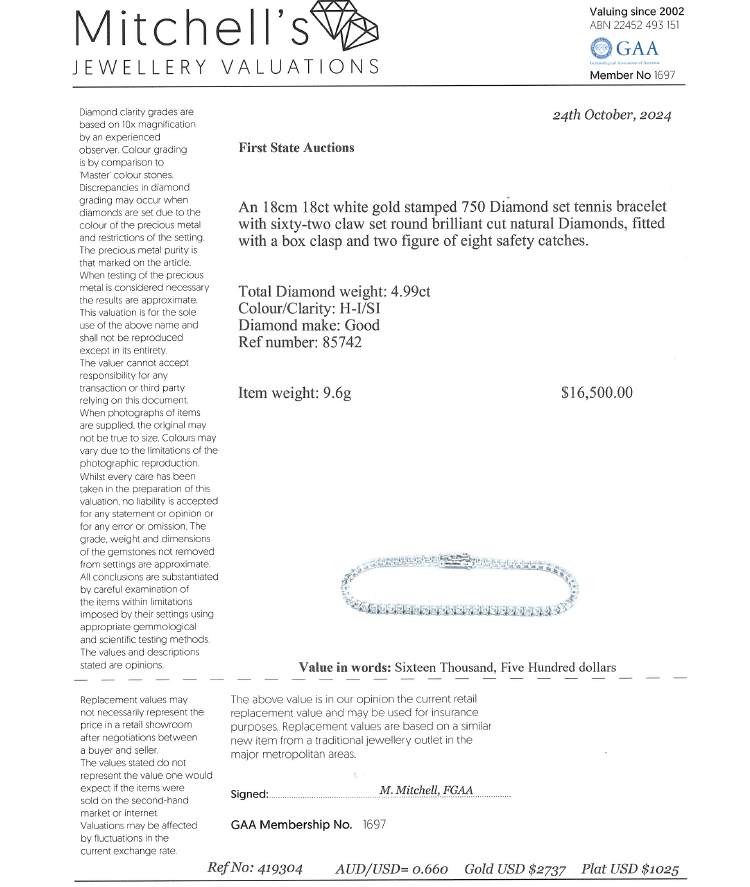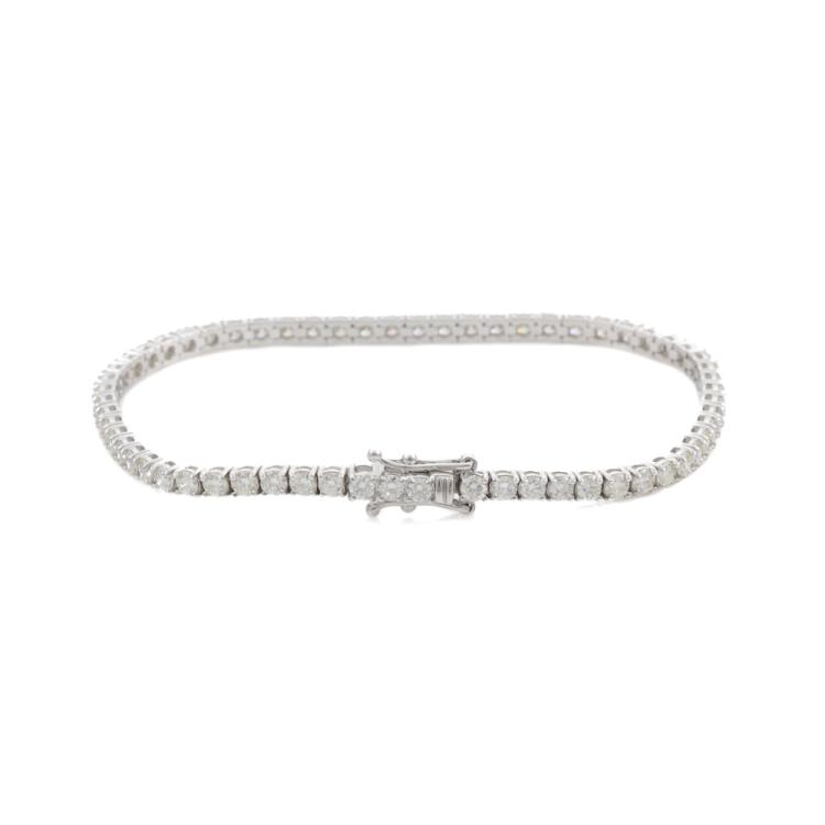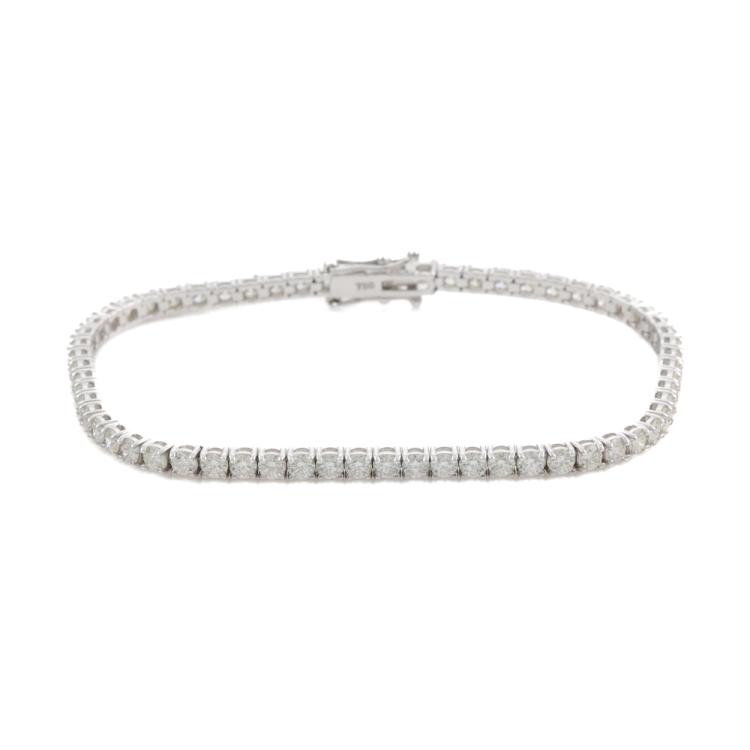 Diamond tennis bracelet with 62 round Natural Diamonds totalling 4.99ct (Estimated grading: H-I SI). 18ct white gold. Length: 18cm. Weight: 9.6g. With Valuation Certificate #419304. (New)