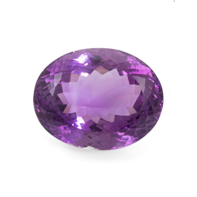 Loose oval cut Amethyst of 52.40ct. Approximate dimensions: 25.5 x 20.3 x 15.9mm. Note: Minor wear on pavilion. (New)