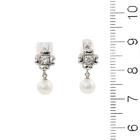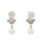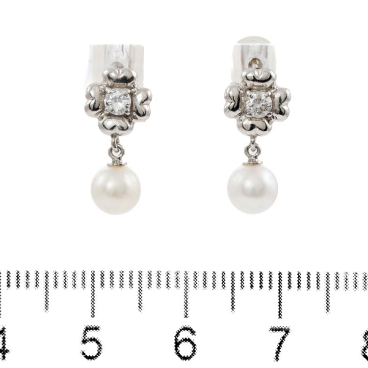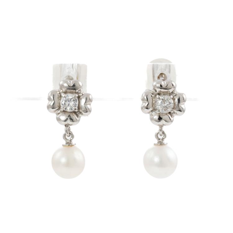 Pearl and Diamond earrings with Cultured Pearls of 5.2mm and 2 round Natural Diamonds totalling 0.16ct. Platinum-900 with 14ct white gold & silicon backs. Weight: 2.2g. (Pre-owned)