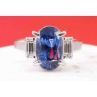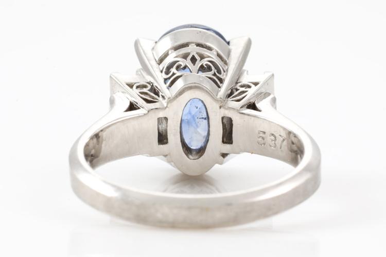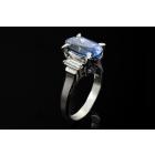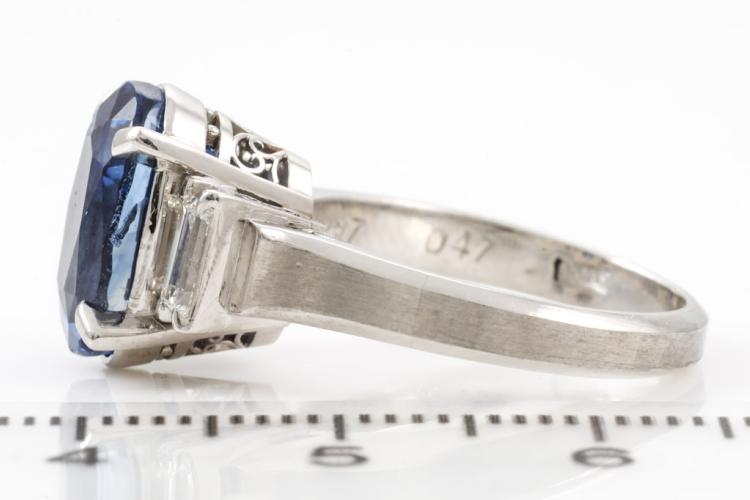 Sapphire and Diamond ring with oval shape blue Natural Sapphire of 5.37ct and baguette cut Natural Diamonds totalling 0.47cts (Estimated grading: G VS). Platinum - 900. Ring size J1/2. Weight: 8.5g. With certification #417224. (Pre-owned)