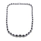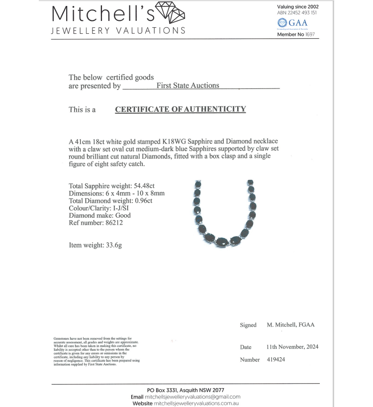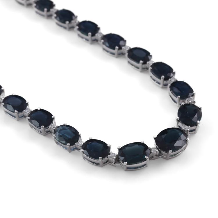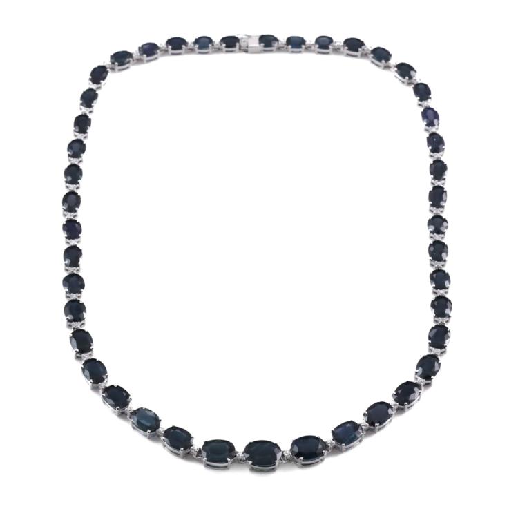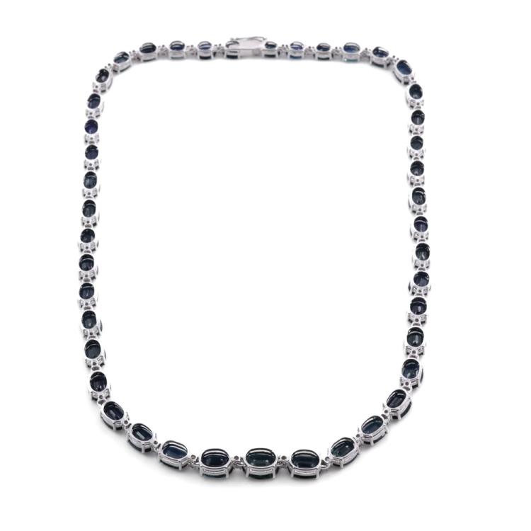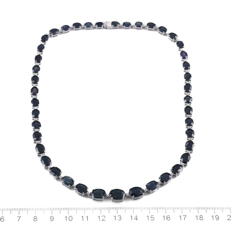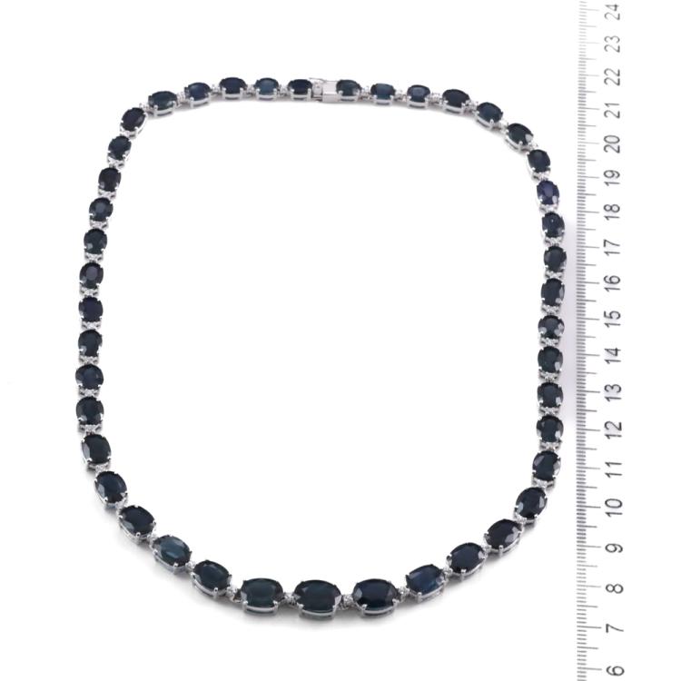Sapphire and Diamond necklace with 43 oval shape dark blue Natural Sapphires totalling 54.48ct and round Natural Diamonds totalling 0.96ct (Estimated grading: I-J SI). 18ct white gold. Length: 41cm, Weight: 33.6g. With Certificate #419424. (Pre-owned)