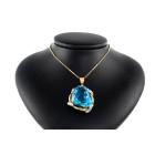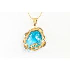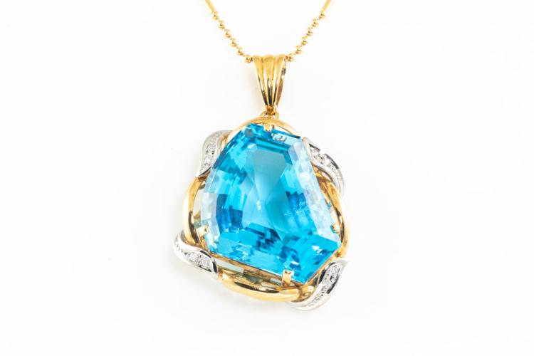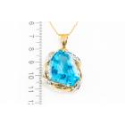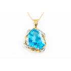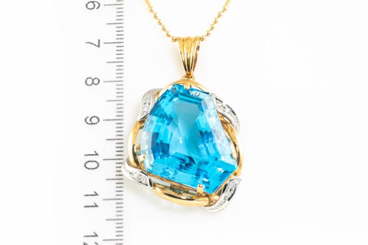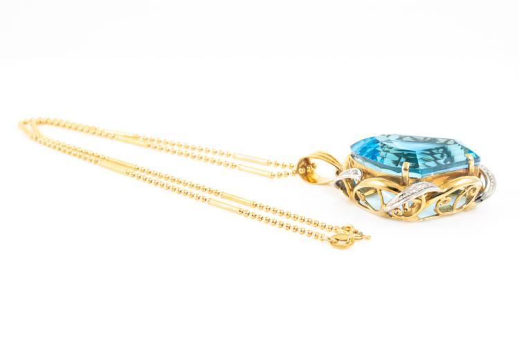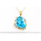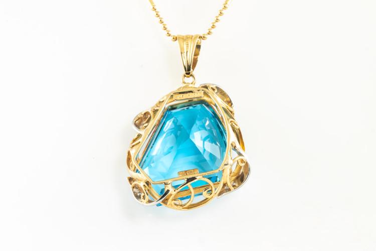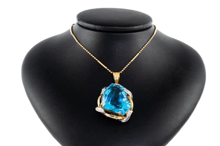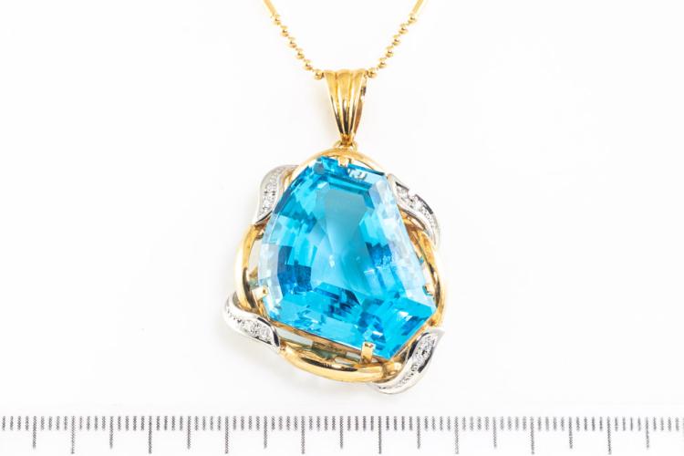 Topaz and Diamond pendant with fancy cut blue Natural Topaz of 58.76ct and round Natural Diamonds totalling 0.12ct. 18ct yellow gold and platinum with 40cm 18ct yellow gold chain. Weight 25.6g. (Pre-owned)
