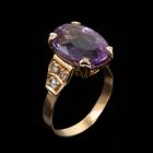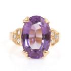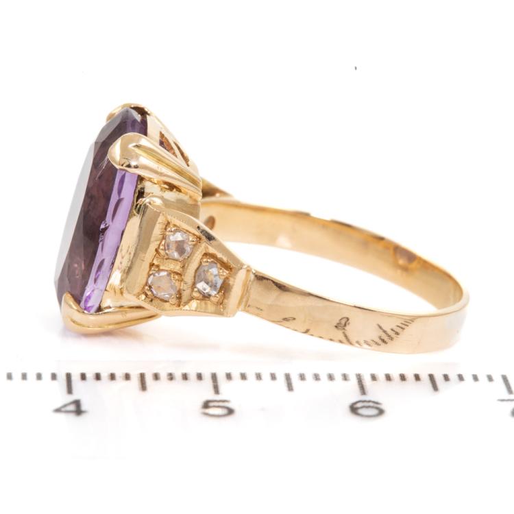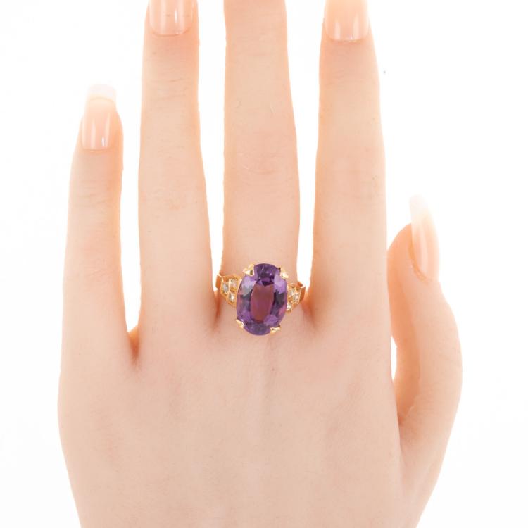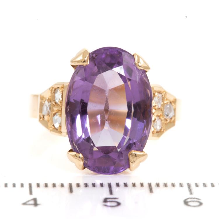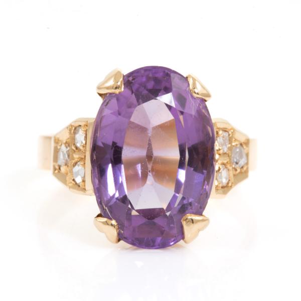 Amethyst and Diamond ring with oval shape Natural Amethyst of approximate 6.00ct and round Natural Diamonds totalling 0.15ct. 17ct yellow gold (XRF tested - not stamped). Ring size: R1/2. Band width: 3.1mm. Weight: 7.2g. (Pre-Owned)