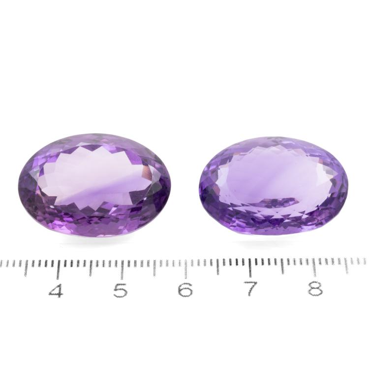 A pair of Loose oval shape natural Amethyst totalling 63.92ct. Approximately sizes: 23.90mm x 17.39mm x 13.08mm and 24.58mm x 17.70mm x 11.48mm). (New)^