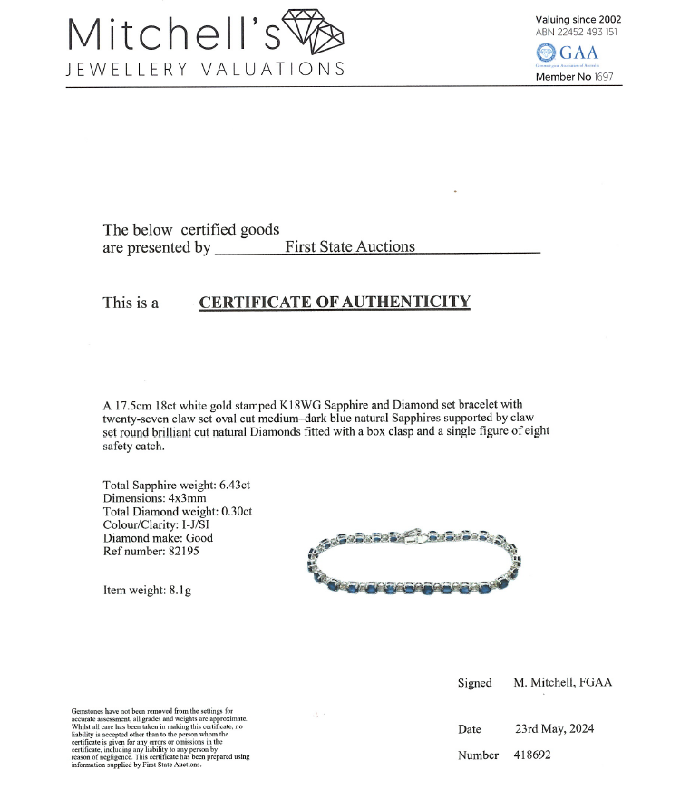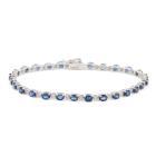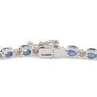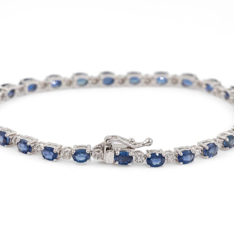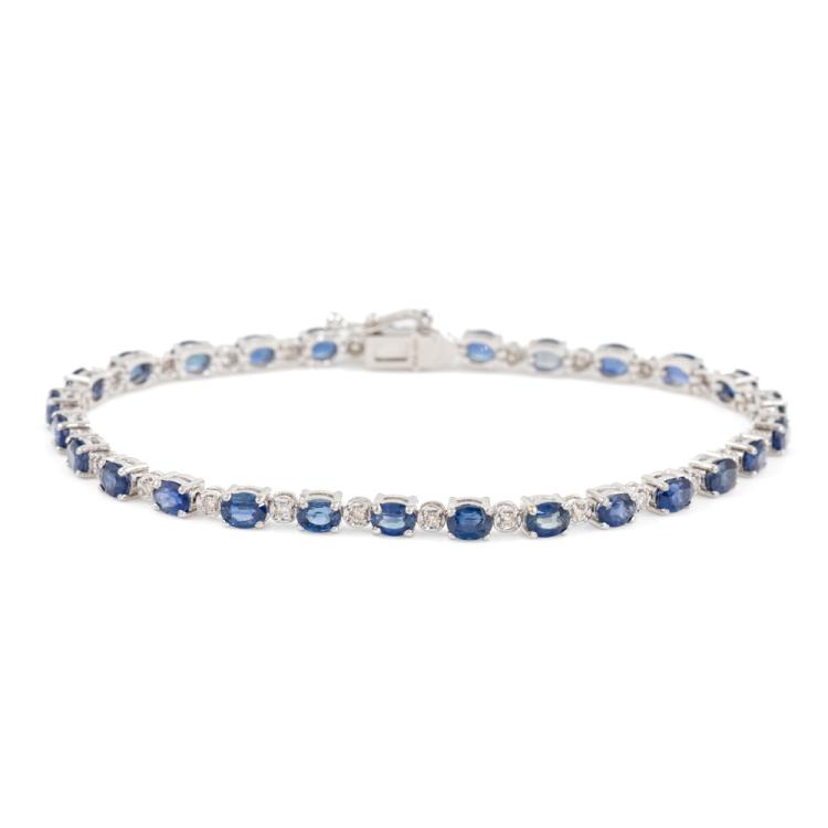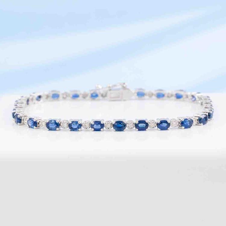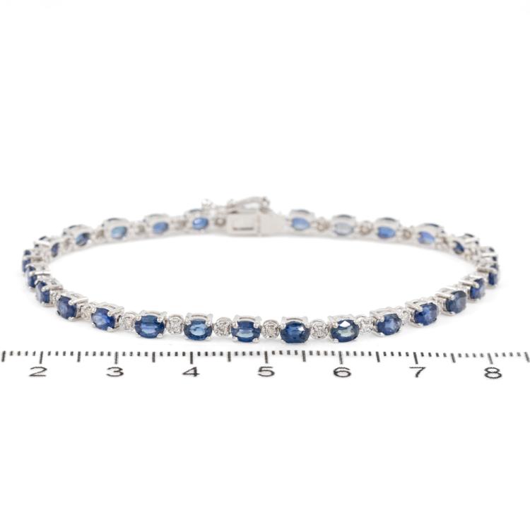 Sapphire and Diamond bracelet with oval shape natural blue Sapphire totalling 6.43ct and round natural Diamonds totalling 0.30ct (Estimated grading: I-J SI). 18ct white gold. Length: 17.5cm. Weight: 8.1g. With Certificate #418692. (Pre-owned)