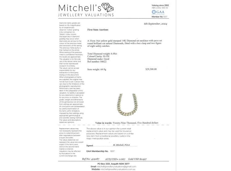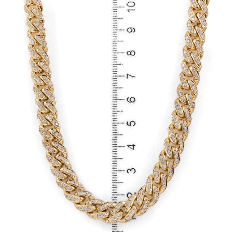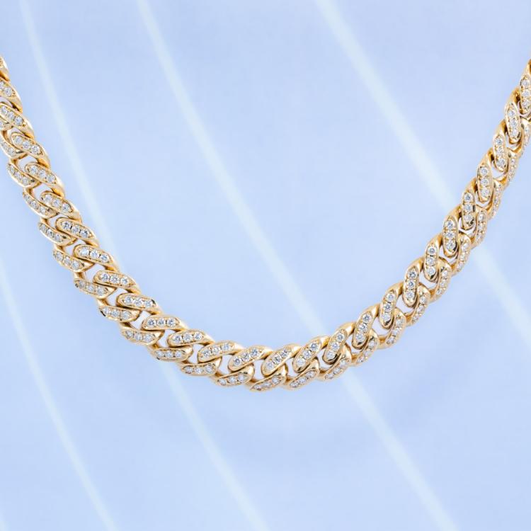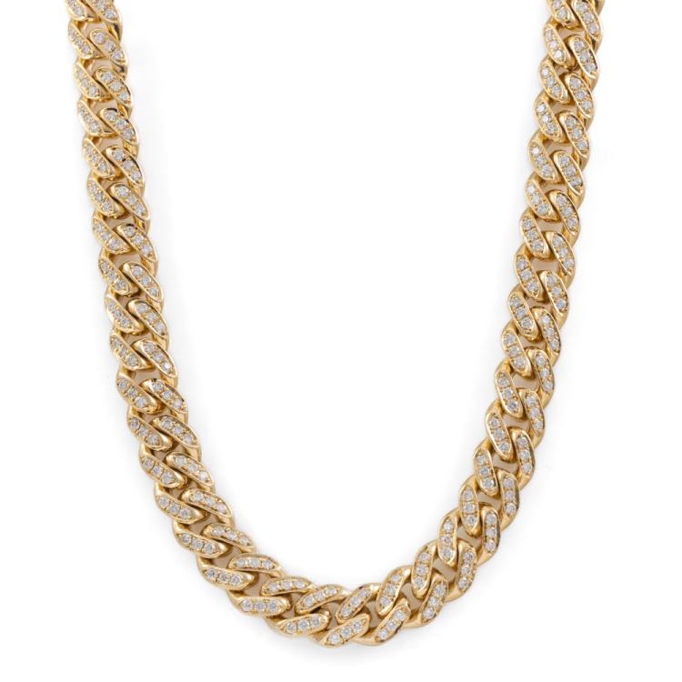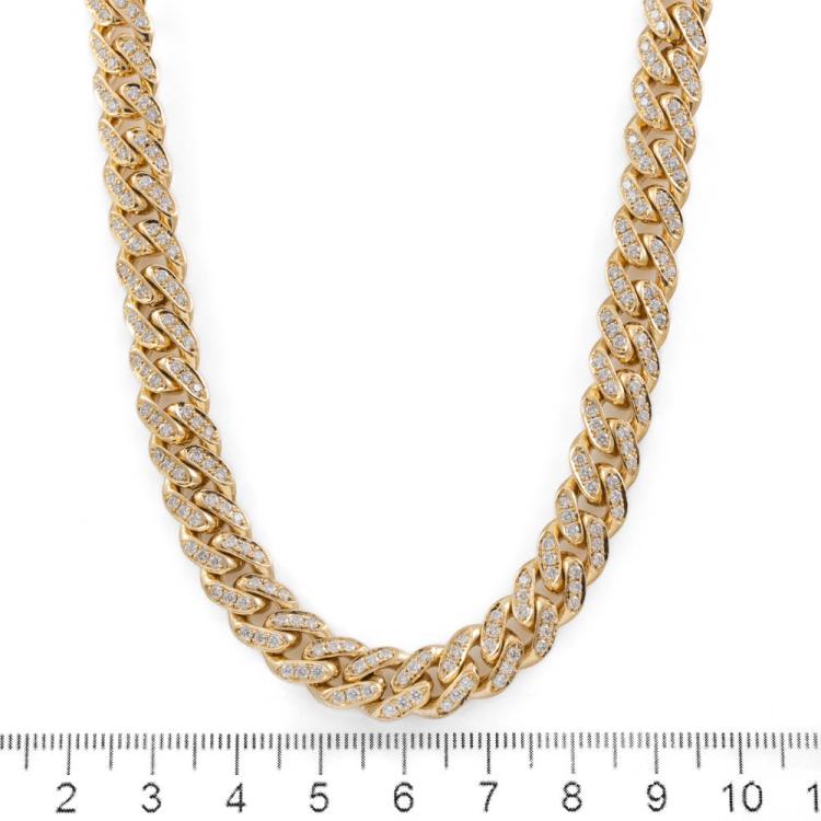 Cuban chain necklace with pave set round Natural Diamonds totalling approximately 6.48ct. (Estimated grading: H-I SI). 14ct yellow gold. Length: 33.0cm. Width: 14.6mm. Weight: 64.9g. With Valuation Certificate: #419087 (Pre-owned)