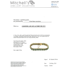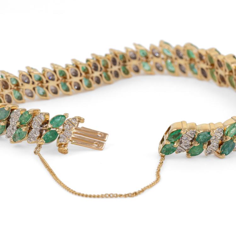 Emerald and Diamond bracelet with marquise cut natural Emerald totalling 6.50ct and round natural Diamonds totalling 0.50ct (Estimated grading: I-J SI). 18ct yellow gold. Length: 16cm. Weight: 26.6g. With Certificate #418694. (Pre-Owned)