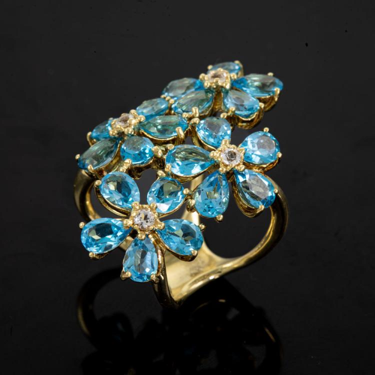 Topaz ring with pear shape natural blue Topaz (5.4 x 4.0mm) totalling approx. 7.20ct and round natural light pink Topaz totalling approx. 0.16ct. 18ct yellow gold. Ring size L - ring resizing is not recommended. Length of design on finger: 40.0mm. Weight: 14.9g. (Pre-owned)