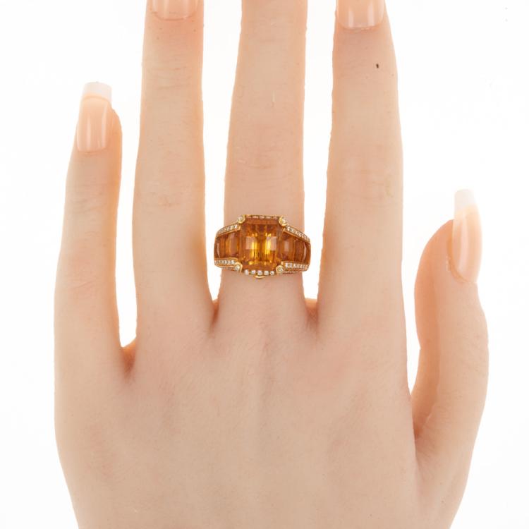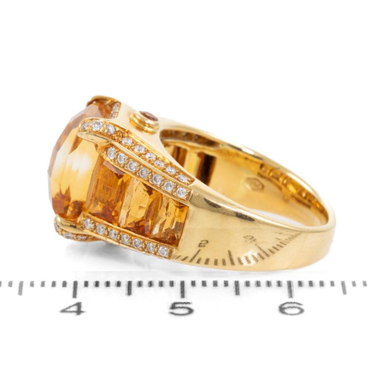 Citrine and Diamond ring with round & fancy cut natural Citrine totalling 9.28ct (note small chip on 1 stone) and round natural Diamonds totalling 0.38cts (Estimated grading: H SI). 18ct yellow gold. Ring size M. Band width: 3.2mm-7.6mm. Weight: 10.6g. (Pre-owned)