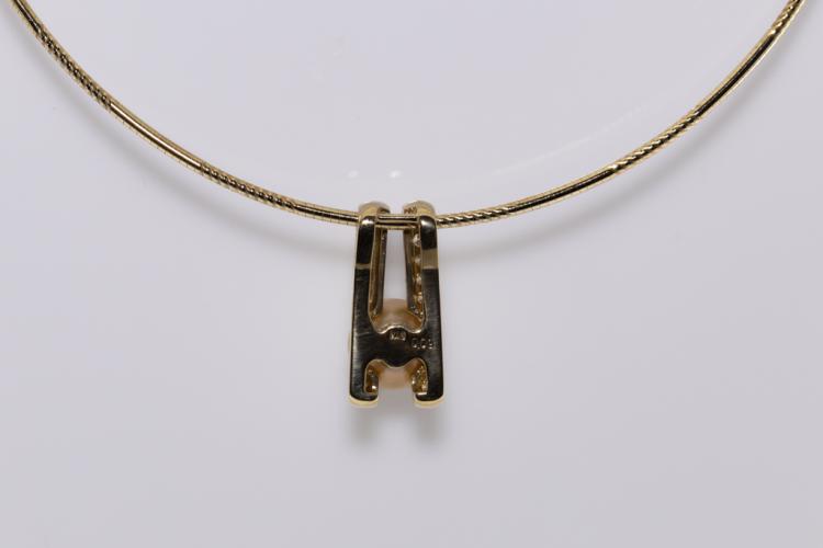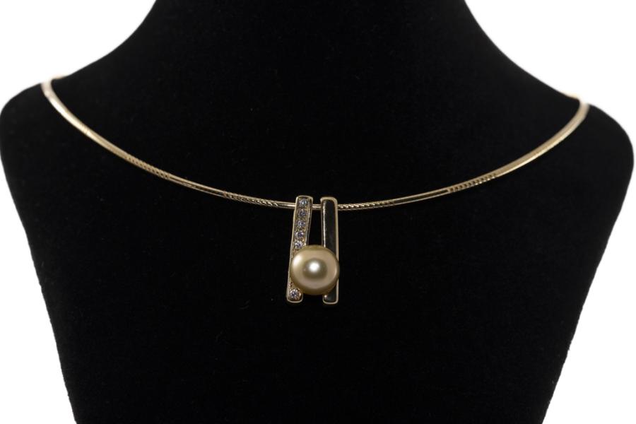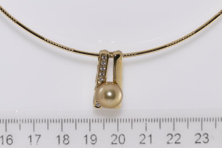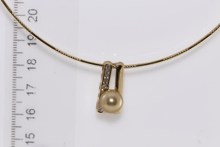 Pearl and Diamond pendant with Golden South Sea Pearl of 9.3mm and Natural Diamonds totalling 0.09ct. 18ct yellow gold with 18ct yellow gold Omega 42cm chain. Weight: 13.8g. (Pre-owned)