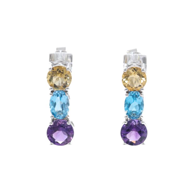 Amethyst, Topaz and Citrine earrings with round Natural Amethyst of 1.15ct, oval shape Natural Blue Topaz of 1.08ct and round Natural Citrine of 0.86ct. 14ct white gold. Weight: 3.1g. (New)
