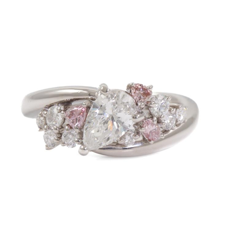 Diamond ring with a centre pear shape Natural Diamond of 0.70ct (Estimated grading: H-I SI2), oval & trilliant cut Argyle origin Pink Natural Diamonds totalling 0.18ct (Oval shape Diamond of 0.056ct with GSL Report graded as Fancy Intense Pink P1# AA70009/2. Origin: Argyle Deposit, Western Australia) & round Natural Diamonds totalling 0.33ct (Estimated grading: G-H SI). Platinum-900. Ring size M. Band width: 2.7mm. Weight: 8.2g. With Valuation Certificate #419451. (Pre-owned)