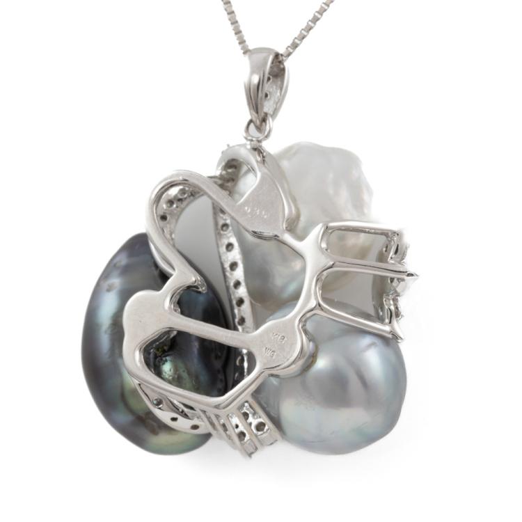 Pearl and Diamond pendant with 3 baroque Pearls (2 South Sea Pearls & 1 Tahitian Pearl) and round natural Diamonds totalling 0.35ct (Estimated grading: H-I SI). 18ct white gold with 18ct white gold adjustable 45cm chain. Weight: 11.2g. (Pre-owned)