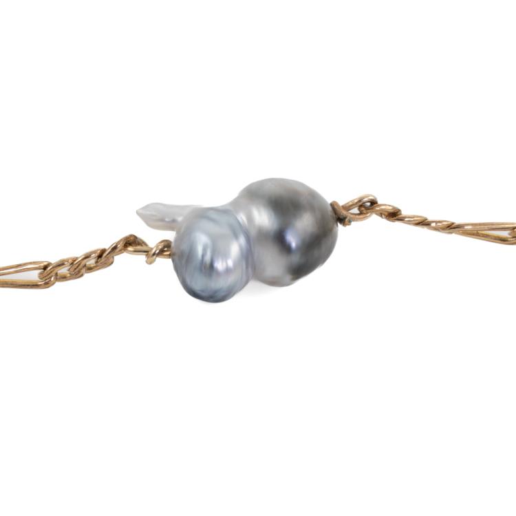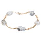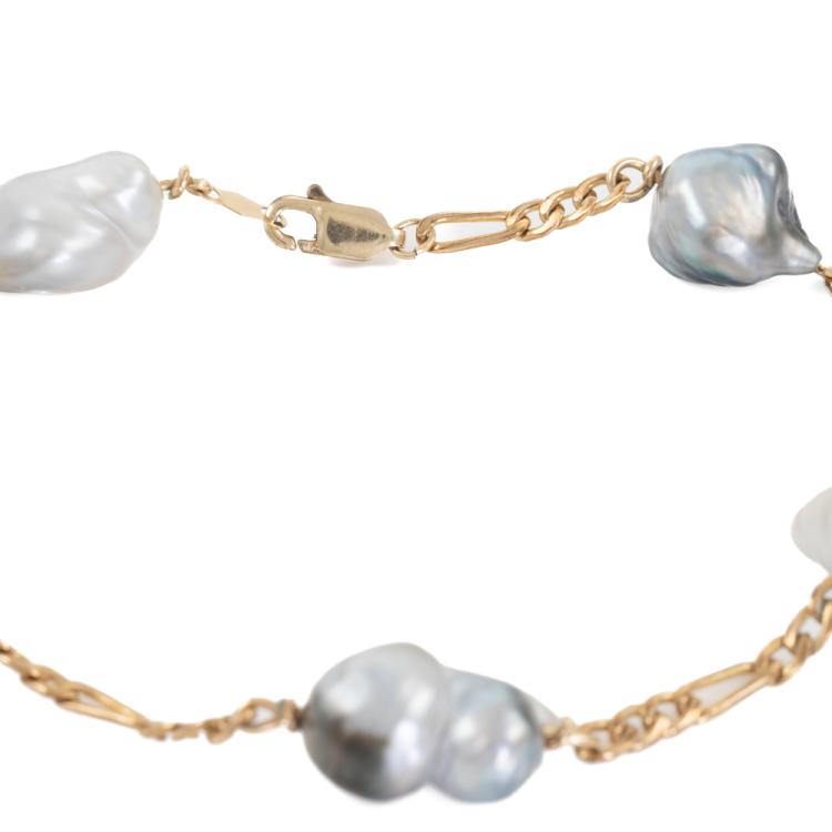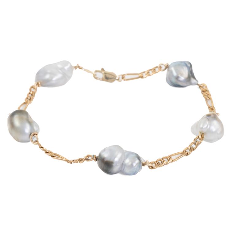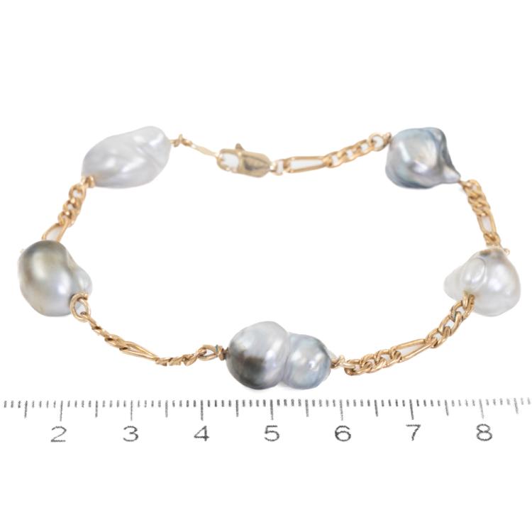 Pearl bracelet with 5 grey to bluish grey baroque South Sea Pearls. Pearl size: 15.3 x 10.3mm - 13.6 x 10.8mm. 14ct yellow gold and 14ct yellow gold (XRF tested, stamped 14K). Length: 21.5cm. Weight: 10.9g (Pre-owned)