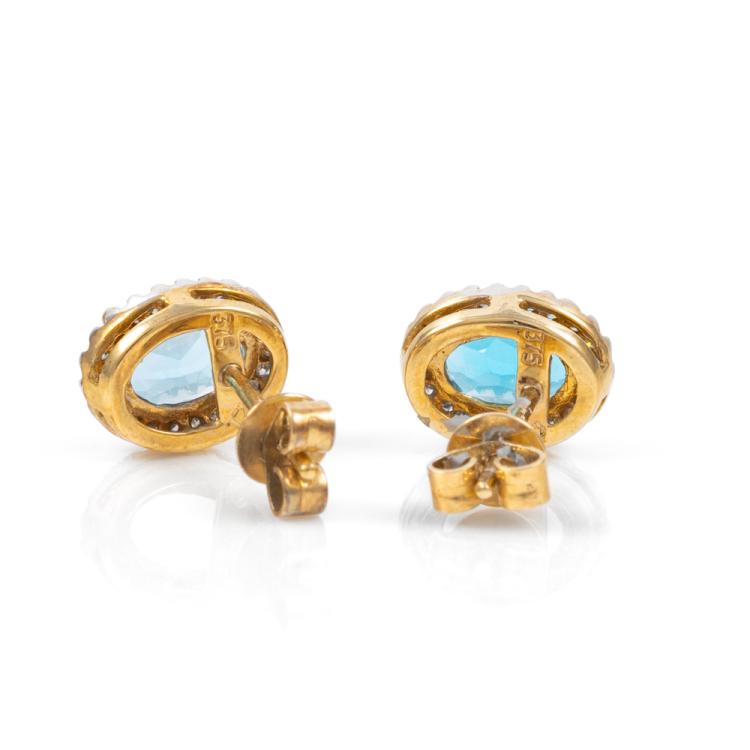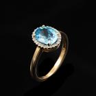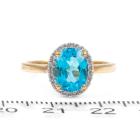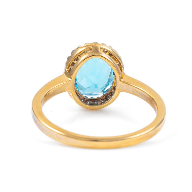 Two piece Topaz set: incl. 1) Blue Topaz ring with oval natural blue Topaz of approximately 2.00ct & round natural Diamonds totalling 0.10ct, ring size N1/2, band width: 1.8mm. 2) Topaz earrings with oval natural blue Topaz totalling approximately 1.70ct & round natural Diamonds of 0.15ct. Both 9ct yellow gold with rhodium plated claws. Combined weight: 6.3g. (As new)^