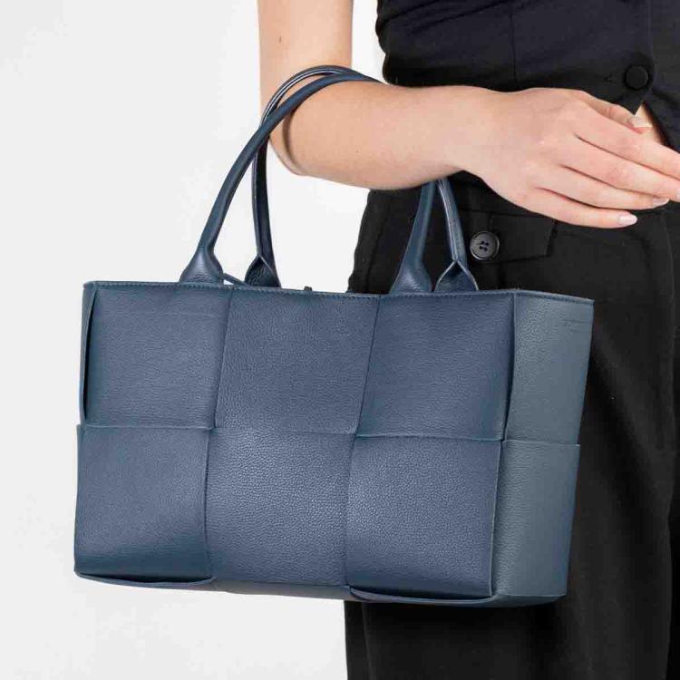 Bottega Veneta small maxi Intrecciato Arco tote bag in woven navy blue calfskin leather. Featuring dual handles, silver-toned hardware and detachable zipped pouch. The leather string closure opens to a blue spacious suede interior. Approximate dimensions: 30cm(L) x 20cm(H) x 11.5cm(D), handle drop 15cm. Accompanied by a Bottega Veneta dustbag. With Entrupy Certificate of Authenticity. (Pre-owned)