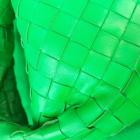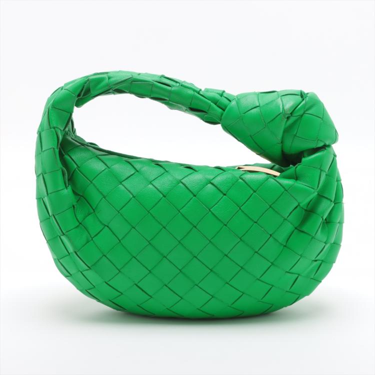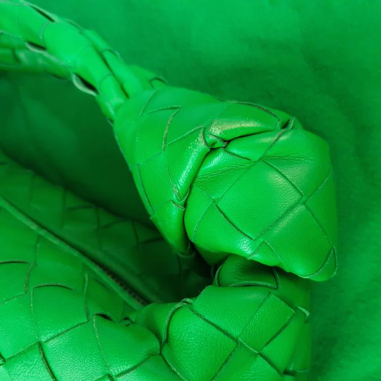 Bottega Veneta mini Jodi in green Intrecciato nappa leather. Featuring gold-toned hardware, a matching handle with a knot detail. The zipper closure opens to a green smooth leather interior. Approximate dimensions: 23cm(L) x 13cm(H) x 2cm(D), handle drop 8cm. Accompanied by Bottega Veneta dustbag. With Entrupy Certificate of Authenticity. (Pre-owned)