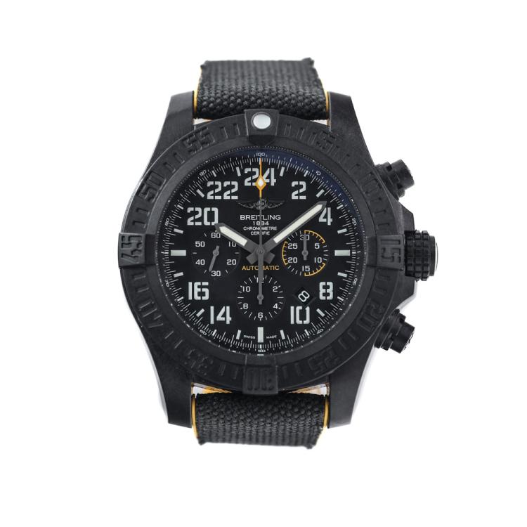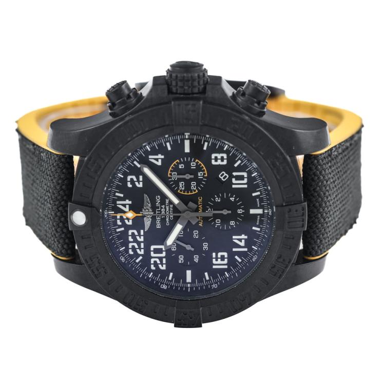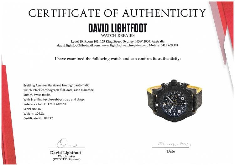 Breitling Avenger Hurricane breitlight automatic mens watch. Black chronograph dial, date, case diameter: 50mm, adjustable max wrist size: 19.5cm, Swiss made. Ref# XB1210E41B1S1. With Breitling textile/rubber strap and clasp. With Certificate of Authenticity, Breitling International E-warranty card dated 22/12/2018 and Breitling box. 3 month FSA warranty. (Pre-Owned)