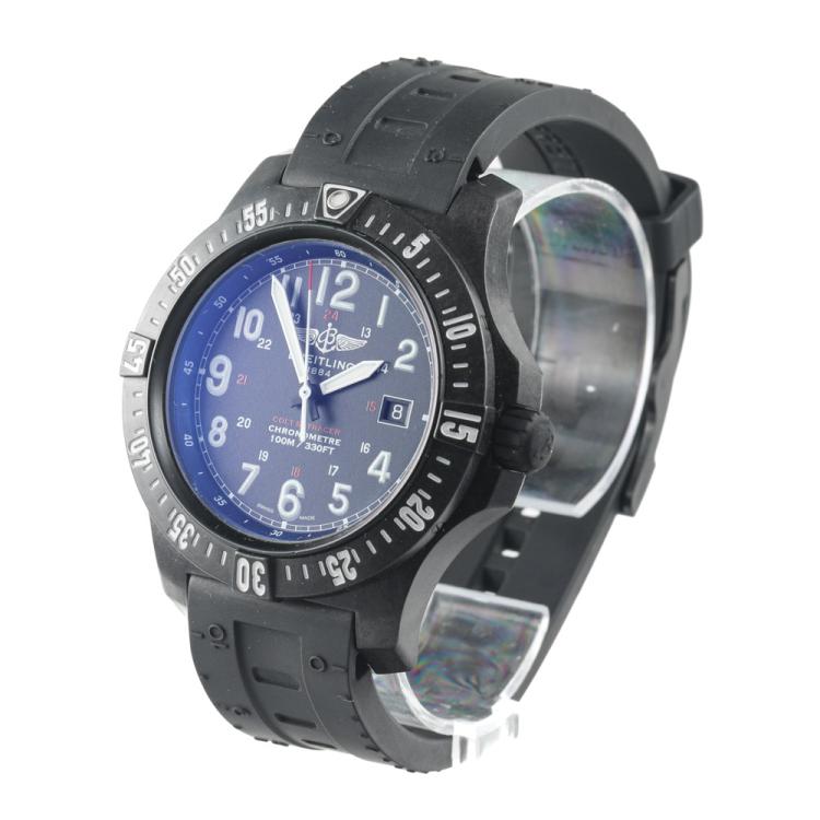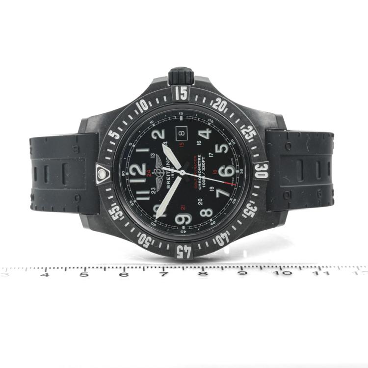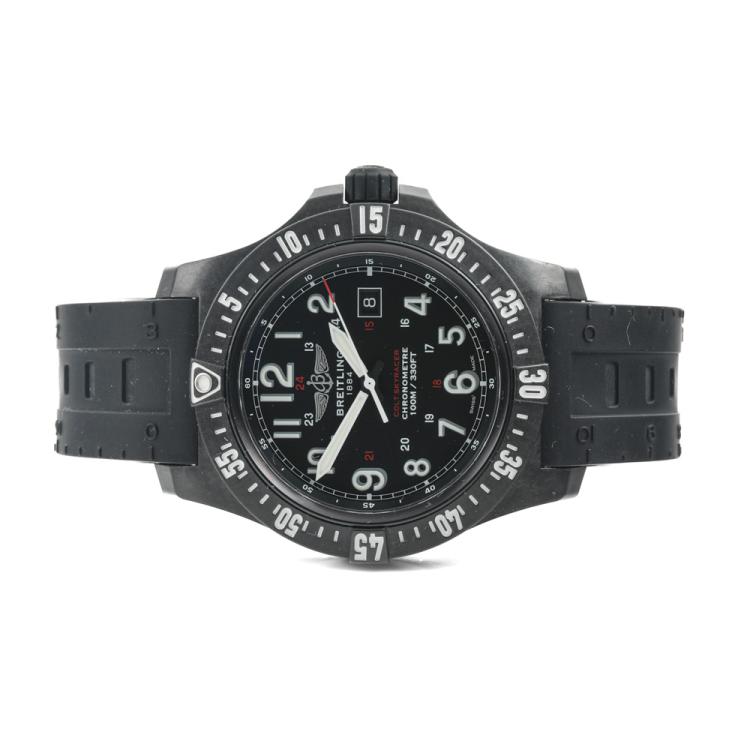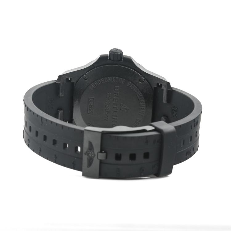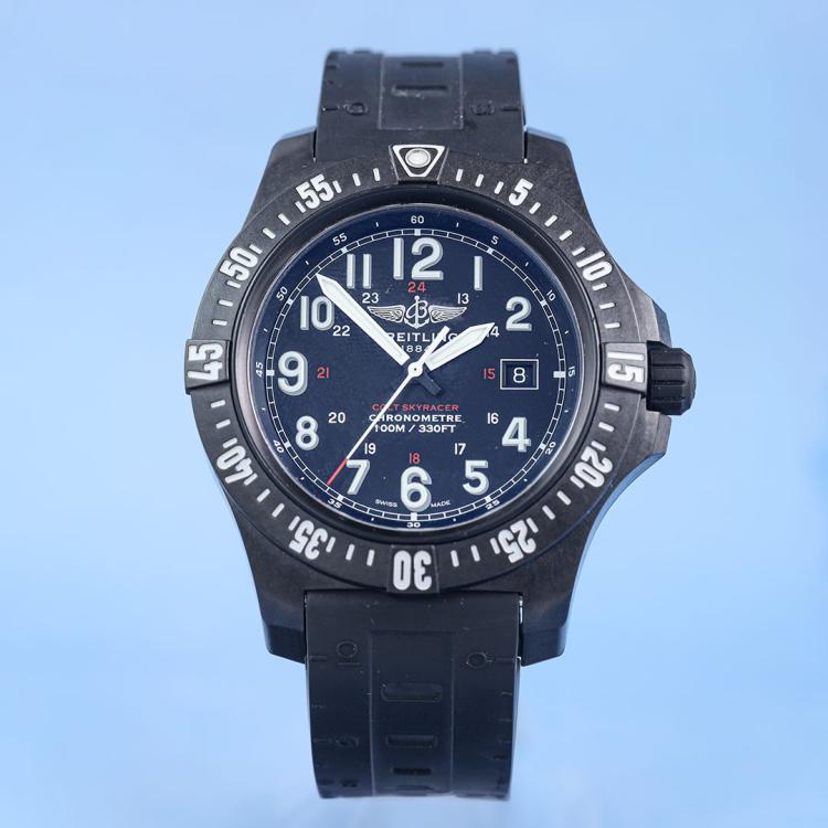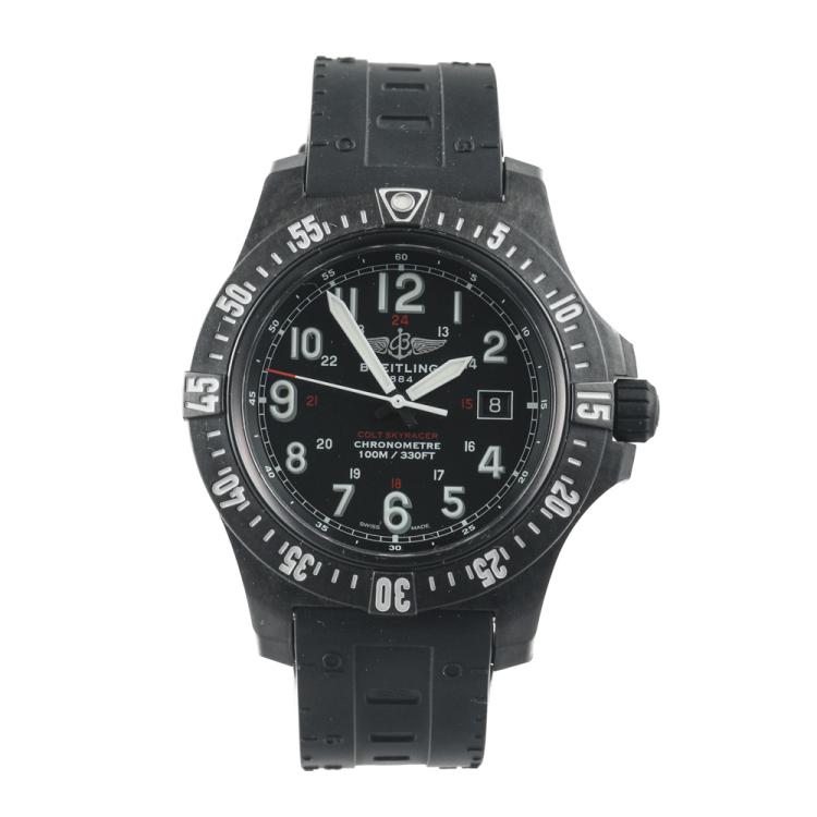 Breitling Colt Skyracer PVD coated polymer quartz mens watch. Black dial, date, case diameter: 45mm, strap length: 23.5cm, Swiss made. Ref# X74320. With Breitling black rubber strap and buckle. With Certificate of Authenticity, Breitling International Warranty E-card dated 14/07/2019 and Breitling box. 3 month FSA warranty (Pre-owned)