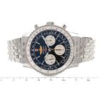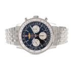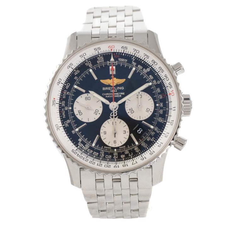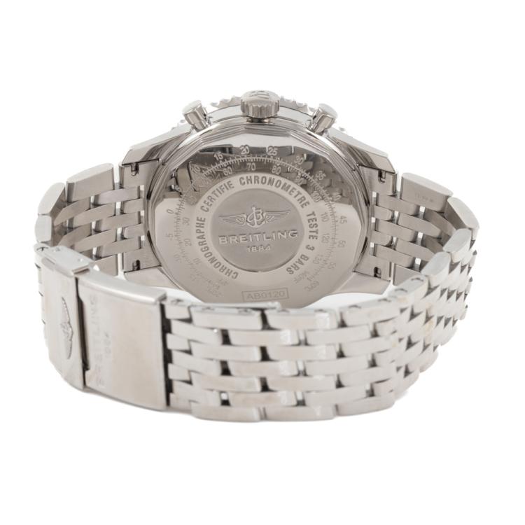 Breitling Navitimer 01 stainless steel automatic mens watch. Black chronograph dial, date, case diameter: 43mm, wrist size: 19.5cm, Swiss made. Ref# AB0120. With Breitling stainless steel and clasp. With Certificate of Authenticity and Breitling case. 3 month FSA warranty. (Pre-owned)