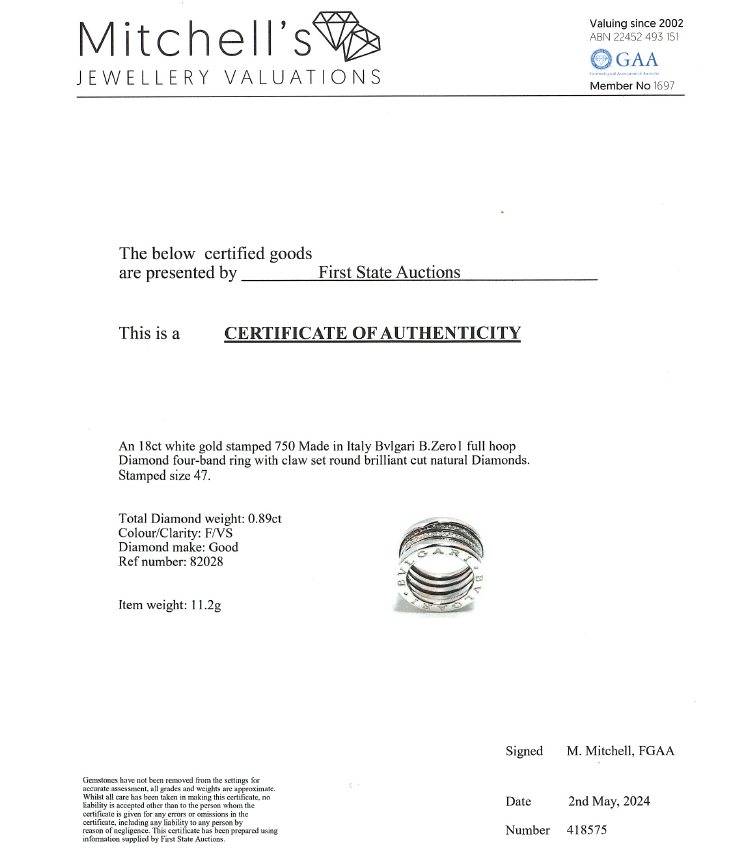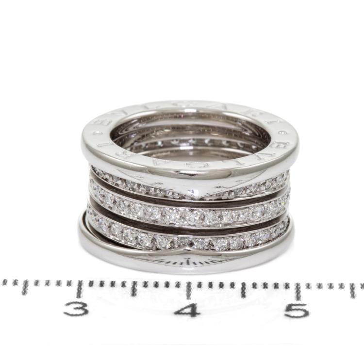 Bvlgari B.Zero1 full hoop Diamond four-band ring with round Natural Diamonds totalling 0.89cts (Estimated grading: F VS). 18ct white gold. Bvlgari stamped size 47, H - ring resizing is not recommended. Made in Italy. Width: 11mm. Weight: 11.2g. With Certificate #418575. (Pre-owned)