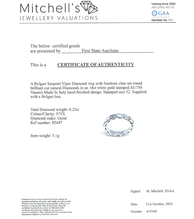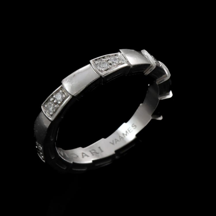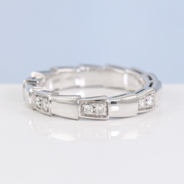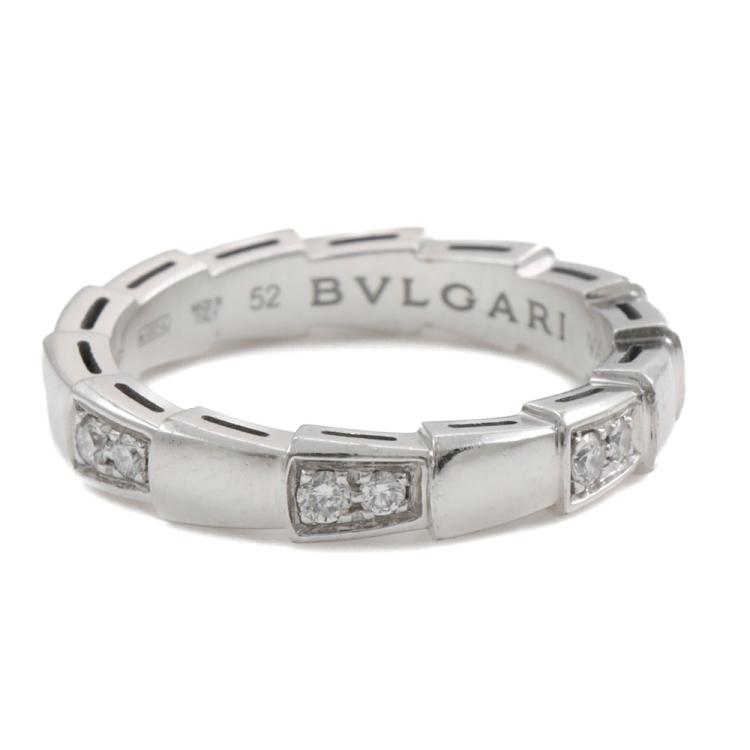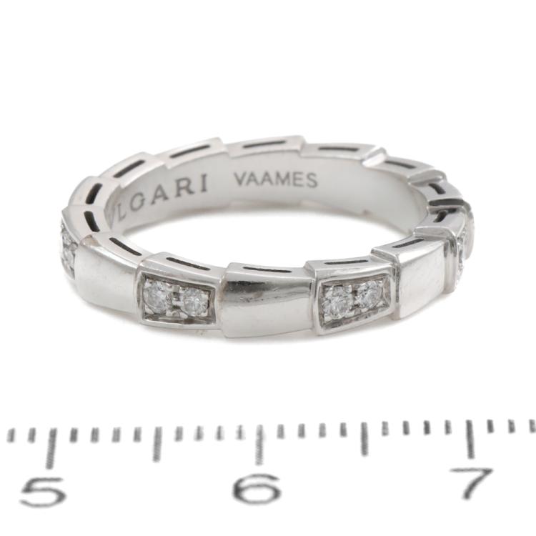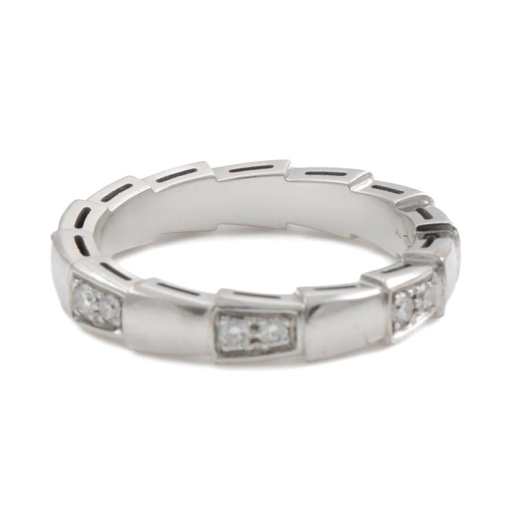 Bvlgari Serpenti Viper Diamond ring with 14 round Natural Diamonds totalling 0.25ct. 18ct white gold. Stamped size 52, L- ring resizing is not recommended. Made in Italy. Weight: 5.1g. With Bvlgari box. With Certificate #419340. (Pre-owned)