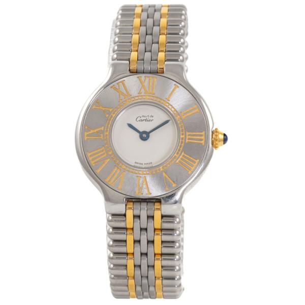 Cartier 21 Must De Cartier stainless steel and 18ct yellow gold quartz ladies watch. White dial, case diameter: 28mm, wrist size: 16.5cm, Swiss made. Ref# 125000P. With Cartier two tone bracelet and clasp. With Certificate of Authenticity. 3 month FSA warranty. (Pre-owned)