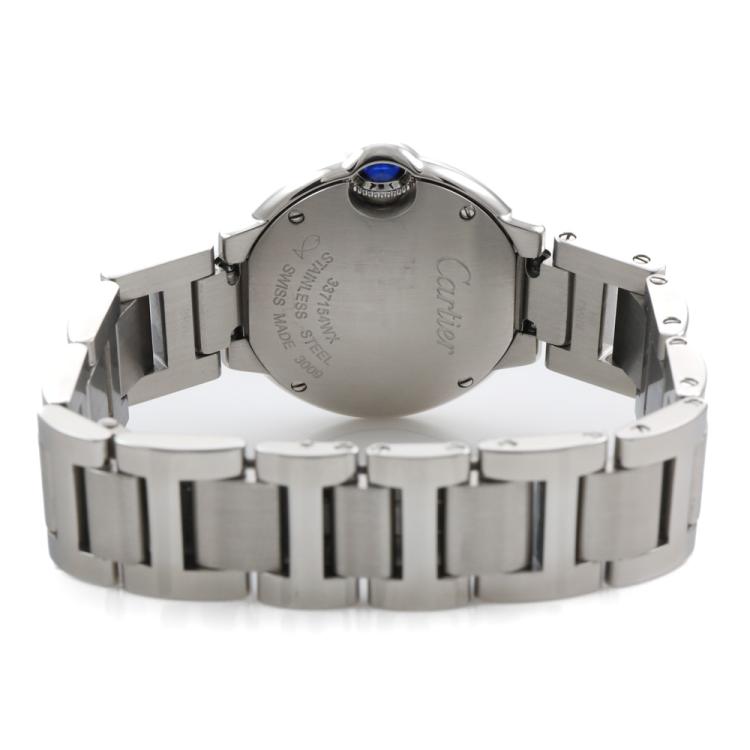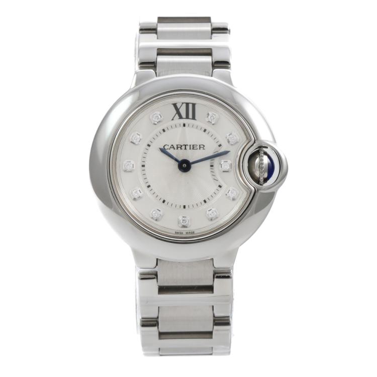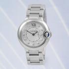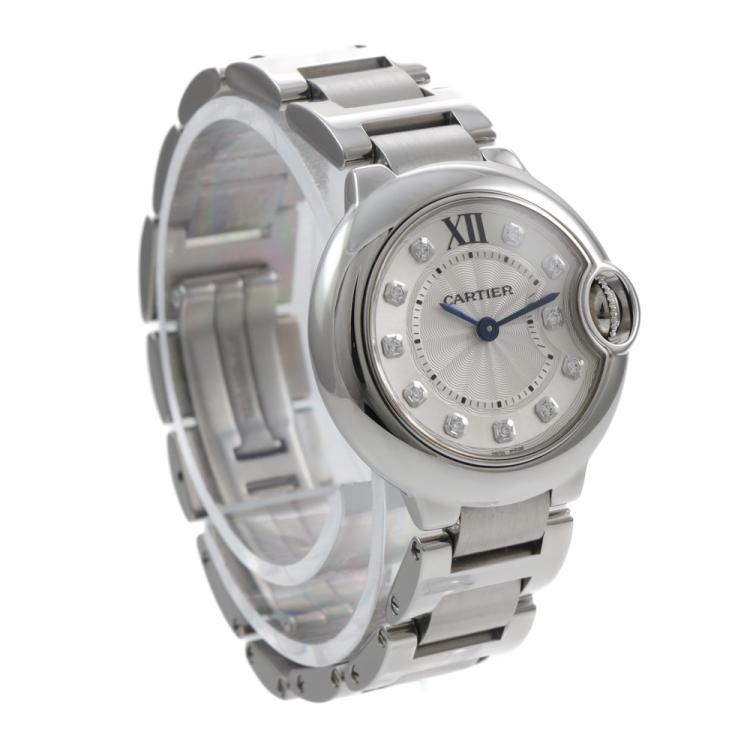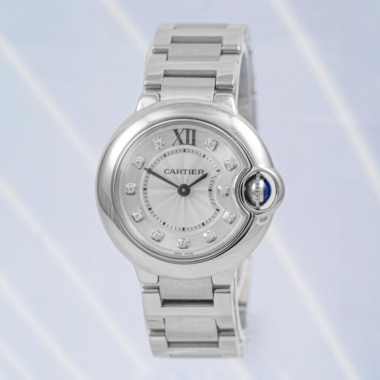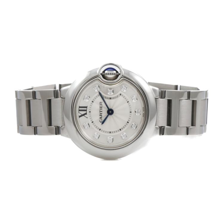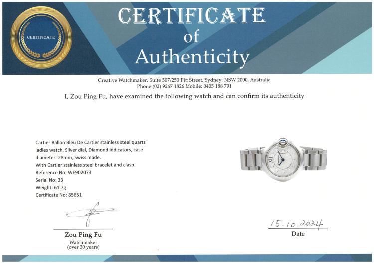 Cartier Ballon Bleu De Cartier stainless steel quartz ladies watch. Silver dial, Diamond indicators, case diameter: 28mm, wrist size: 14cm, Swiss made. Ref# WE902073. With Cartier stainless steel bracelet and clasp. With Certificate of Authenticity. 3 month FSA warranty. (Pre-owned)