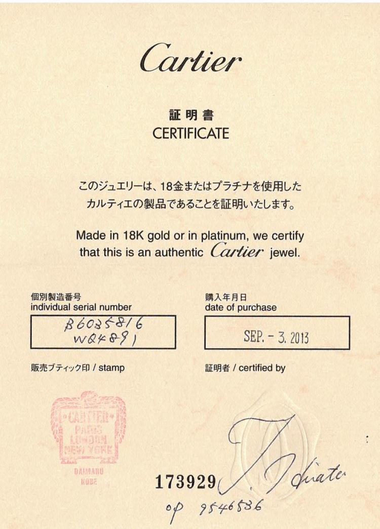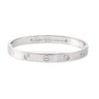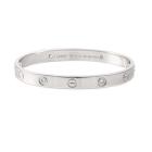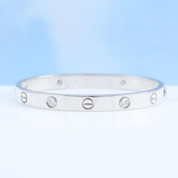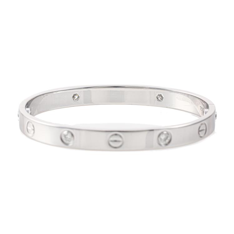Cartier Love bracelet with 4 round natural brilliant cut Diamonds totalling 0.42ct (Estimated grading: F VS). 18ct white gold. Cartier stamped size 16. Width: 6.1mm. Weight: 31.2g. With Cartier box, Cartier screwdriver and Cartier Certificate dated 03/09/13. (Pre-owned)