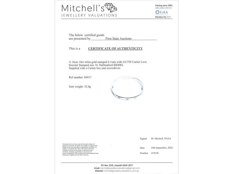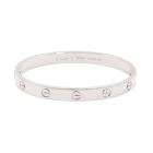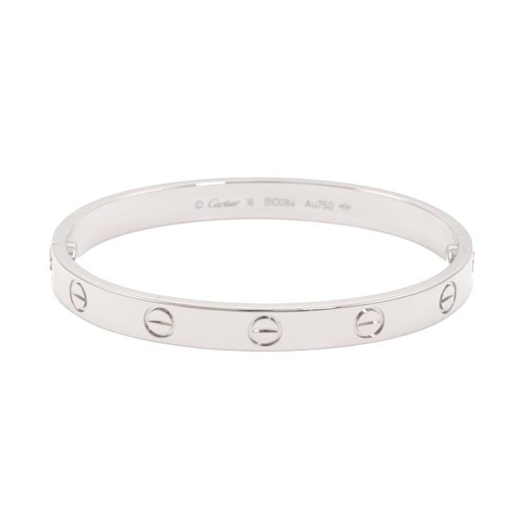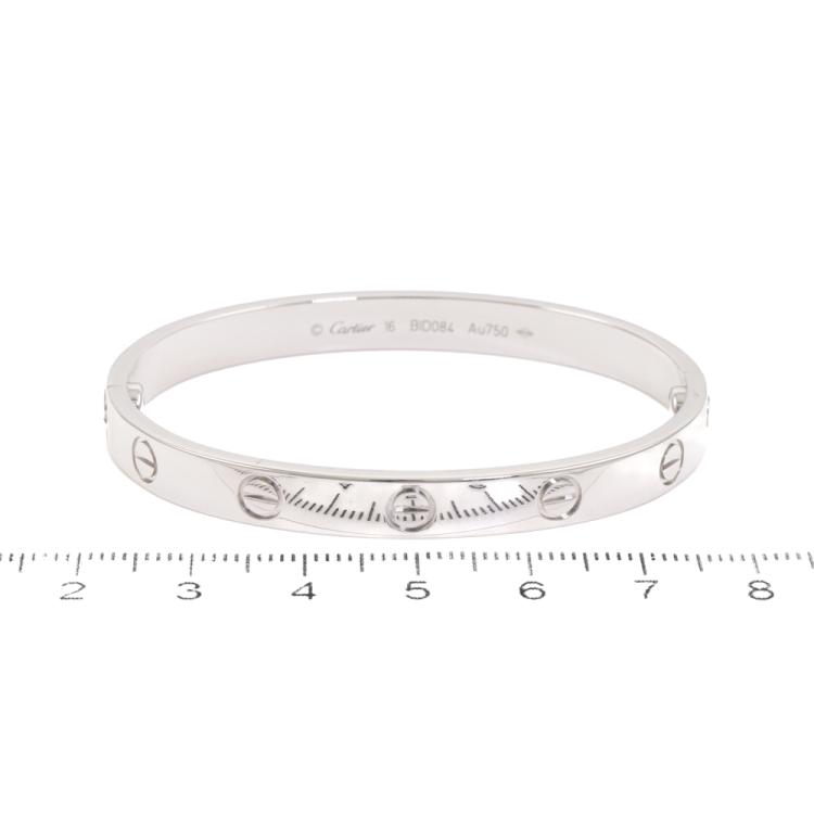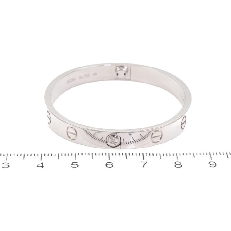 Cartier Love bracelet in 18ct white gold. Width: 6.1mm. Cartier stamped size 16cm. Weight: 32.0g. With Cartier screwdriver and Instruction Booklet inside Cartier box. With Certificate #419146. (Pre-owned)