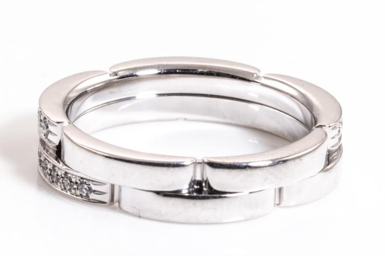 Cartier Maillon Panthere band with two half paved rows of 42 Diamonds totalling 0.30ct (Estimated grading: F VS). 18ct white gold. Cartier stamped size 51, L - ring resizing is not recommended. Width: 4.2 mm. Weight: 6.1g. With Cartier Certificate dated 07/12/2014 and Cartier box. (Pre-owned)