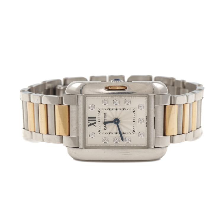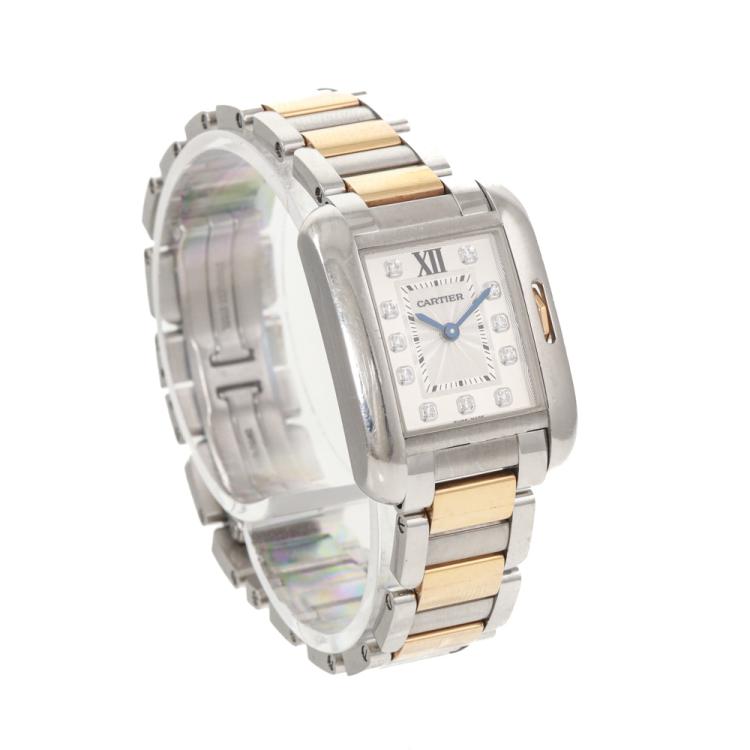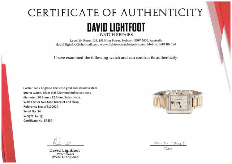 Cartier Tank Anglaise 18ct rose gold and stainless steel quartz ladies watch. Silver dial, Diamond indicators, case diameter: 30.2mm x 22.7mm, wrist size: 17cm, Swiss made. Ref# WT100024. With Cartier two-tone bracelet and clasp. With Certificate of Authenticity and Cartier box. 3 month FSA warranty (Pre-owned)