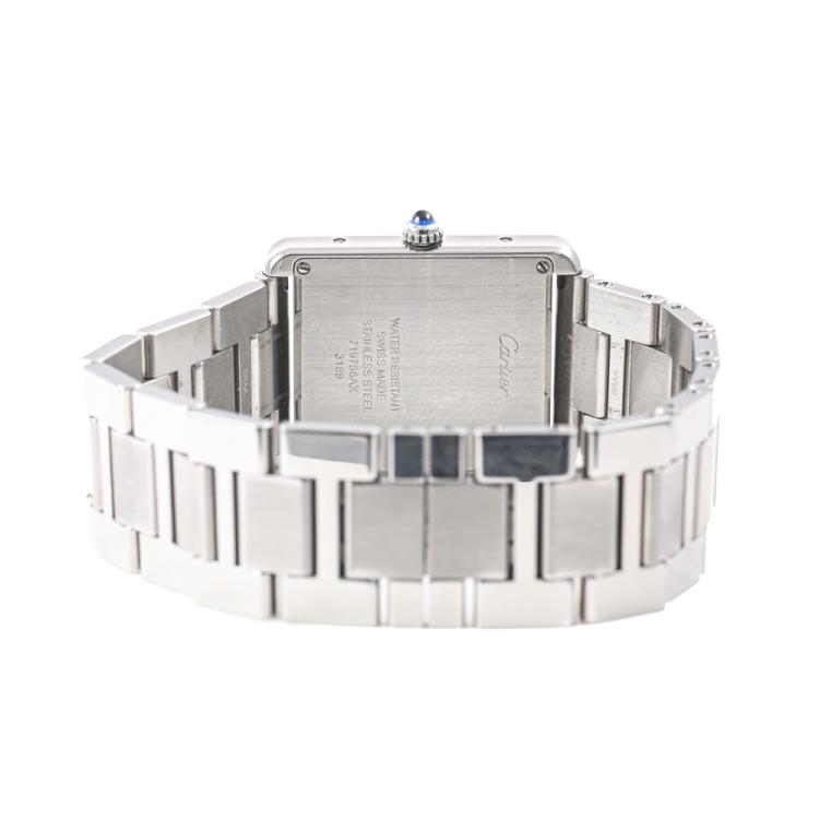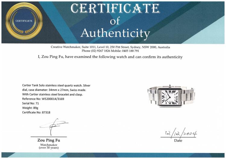 Cartier Tank Solo stainless steel quartz watch. Silver dial, case diameter: 34mm x 27mm, wrist size: 18cm, Swiss made. Ref# W5200014/3169. With Cartier stainless steel bracelet and clasp. With Certificate of Authenticity, Cartier International Limited Warranty card dated 19/10/2020 and Cartier box. 3 month FSA warranty. (Pre-owned)