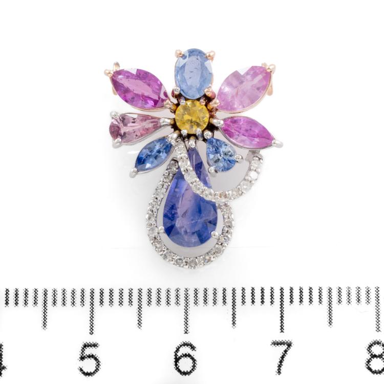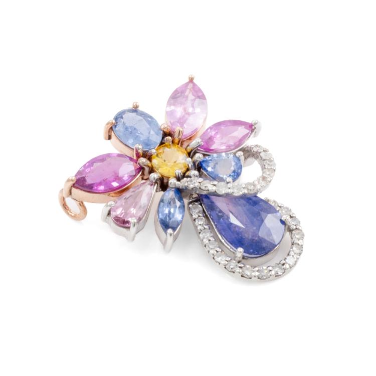 Sapphire and Diamond pendant with mixed cut multi-colour Ceylon natural Sapphires totalling 4.53ct and round natural Diamonds totalling 0.30ct (Estimated grading: G-H SI). 14ct rose & white gold. No chain provided. Weight: 3.1g. With GGTL Report #209449. (As new)