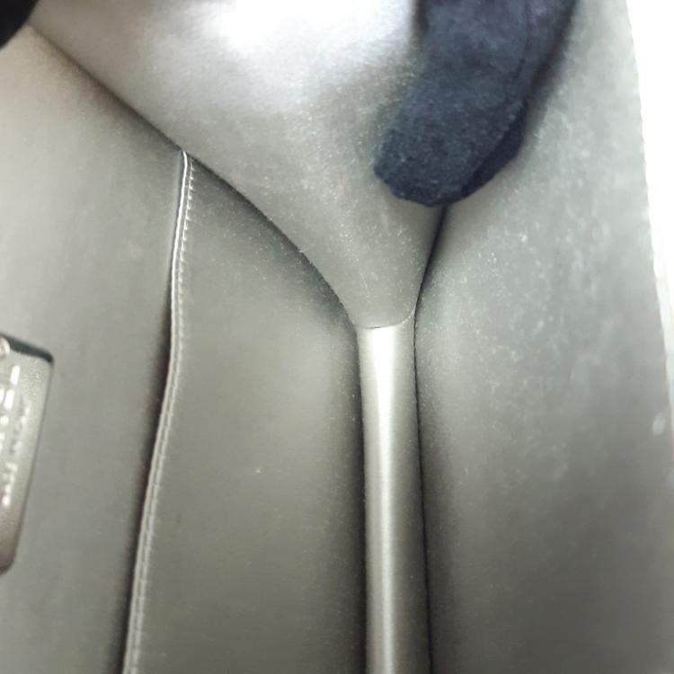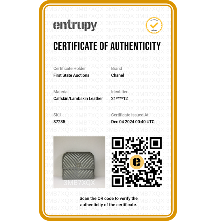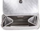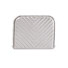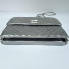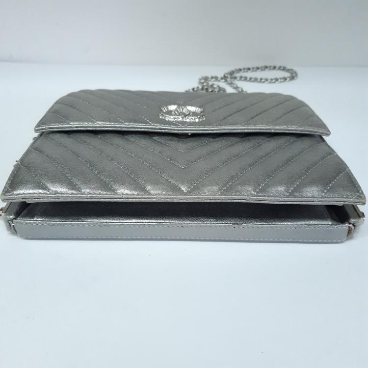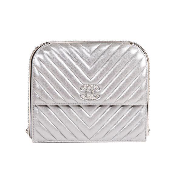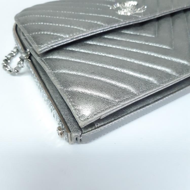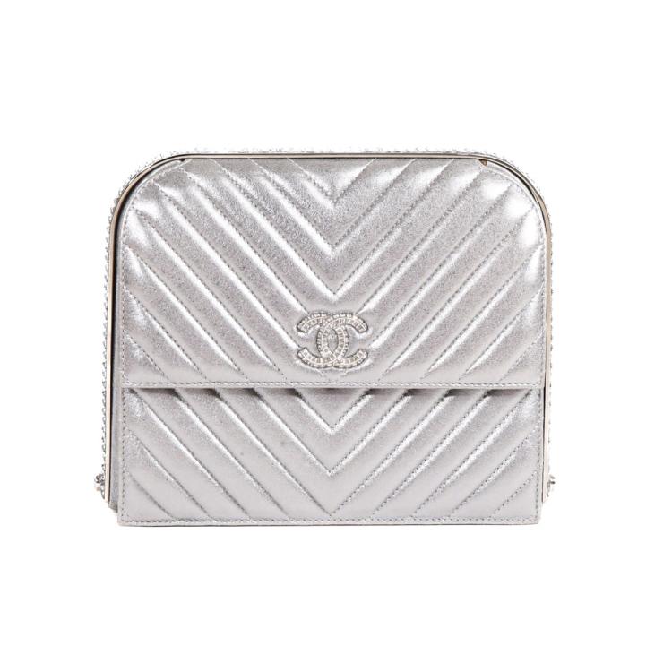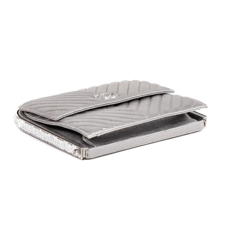 Chanel 15C Paris Dubai clutch on chain from 2015 Cruise Dubai Collection by Karl Lagerfeld (#21xxxxxx). Item was crafted in V-stitch lambskin leather in metallic silver colour, with defined baguette crystals framing, and an ornate CC ornament on front flap. The magnetic button opens to a satin lining interior with a patch pocket. Approx dimensions: 18cm(W) x 16cm(H) x 3cm(D), 53cm chain drop. Accompanied by Chanel dustbag. With Entrupy Certificate of Authenticity. (Pre-owned)