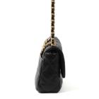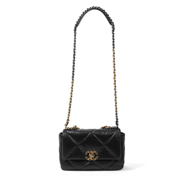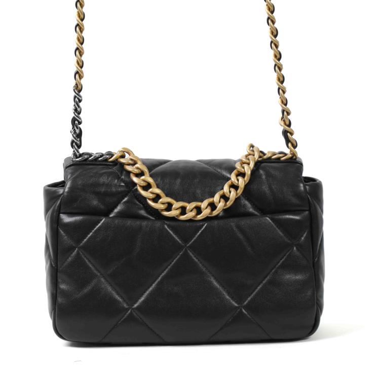 Chanel medium Chanel 19 bag in black, giant diamond quilted lambskin (#HNxxxxxx). Featuring aged gold & silver hardware, an exterior flat pocket at rear, and gold chain detailed CC turn lock on front flap. It opens to a Bordeaux fabric lining interior with a zipper pocket. Approx dimensions: 25cm(L) x 16cm(H) x 7cm(D), 9cm handle height, 50cm shoulder height. Accompanied by Chanel purchase receipt, certificate card, dustbag, box and a generic bag organizer. (As new)