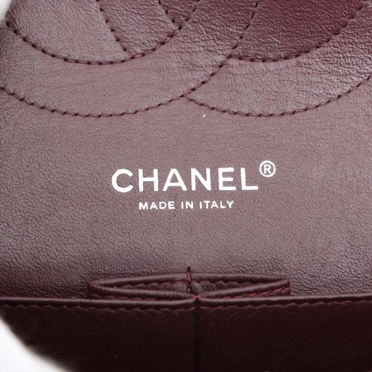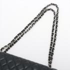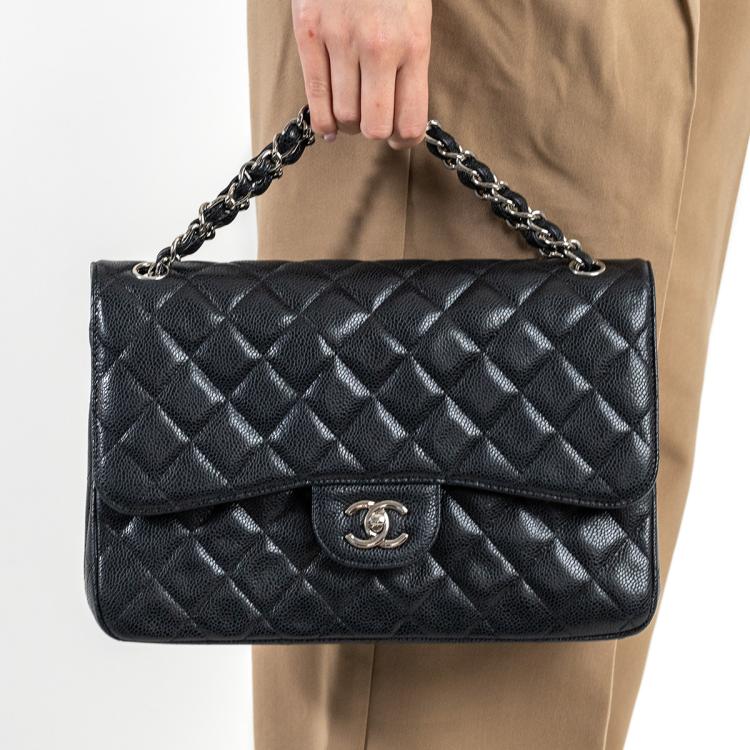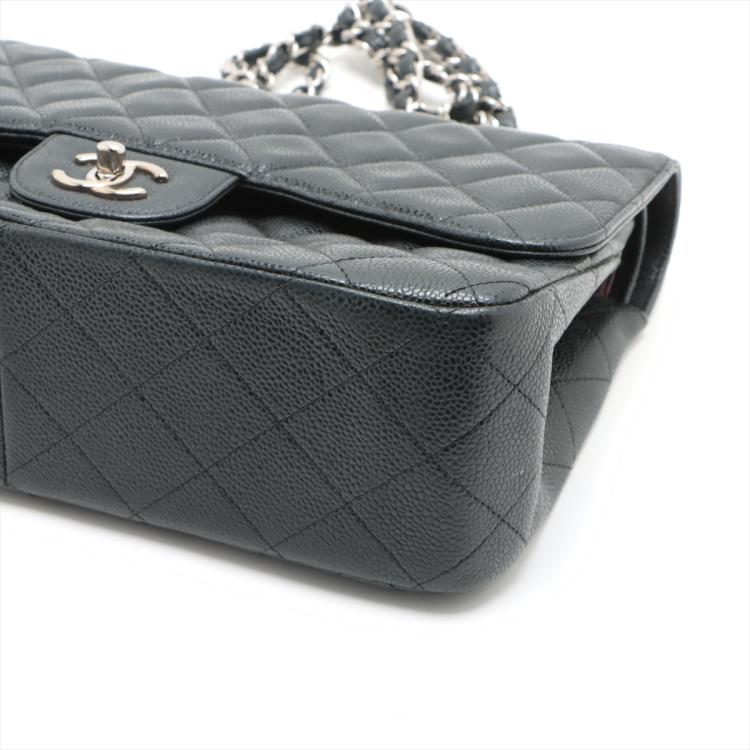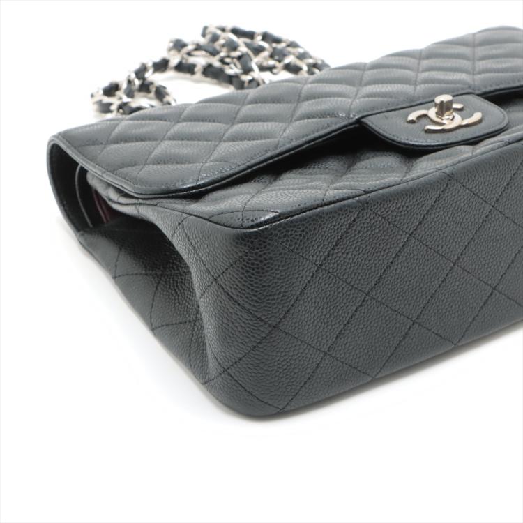 Chanel large double flap bag in black diamond quilted caviarskin with silver-toned hardware. Featuring an exterior rear pocket, a semi-full front flap with a Chanel CC turn lock. This opens to a burgundy leather interior with patch and zipper pockets. Approximate dimensions: 30cm (L) x 19.5cm (H) x 9cm (D), shoulder chain(doubled) height 34cm. Accompanied by Chanel certificate card, info booklet, dust bag and box. With Entrupy Certificate of Authenticity. (Pre-owned)