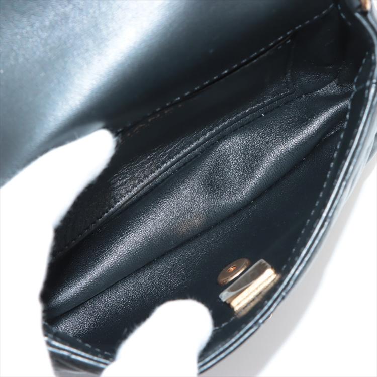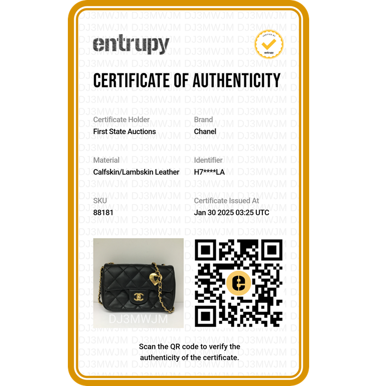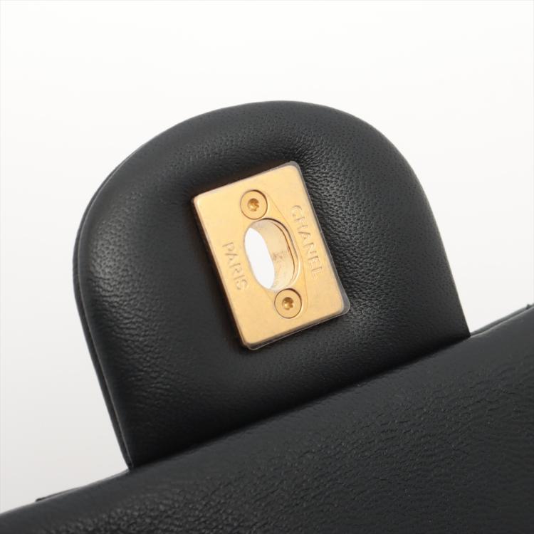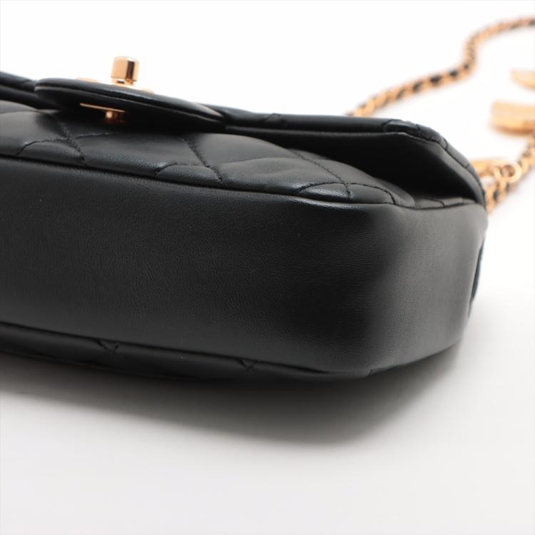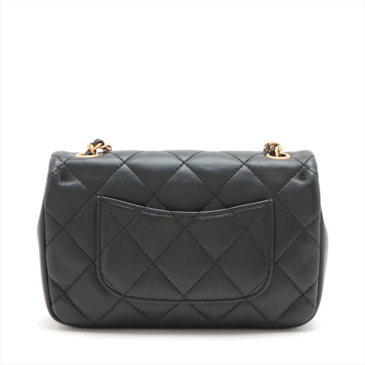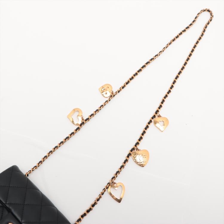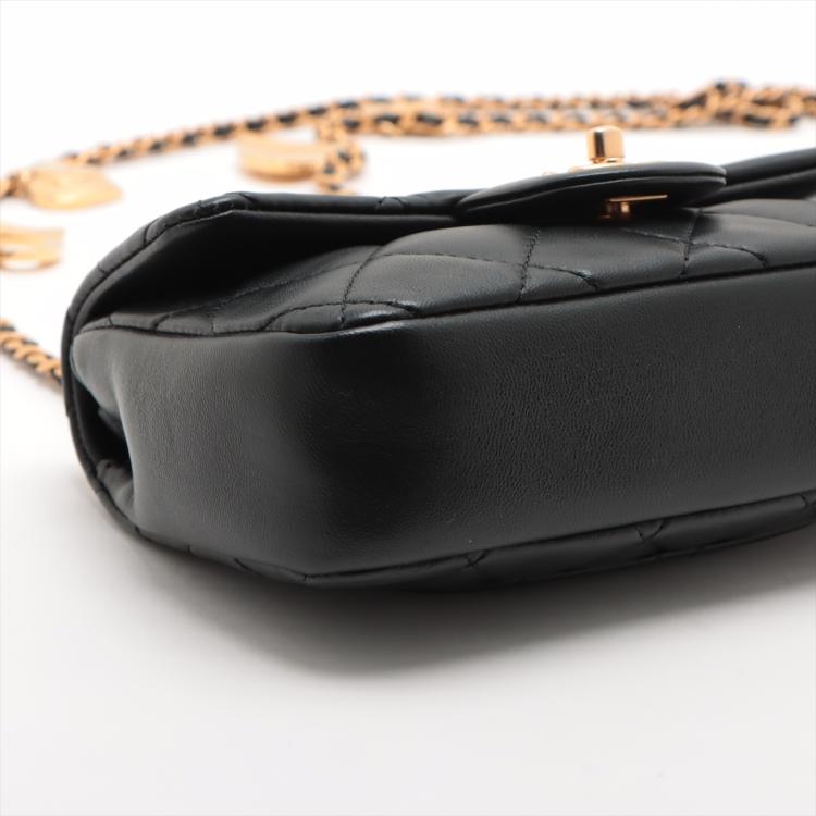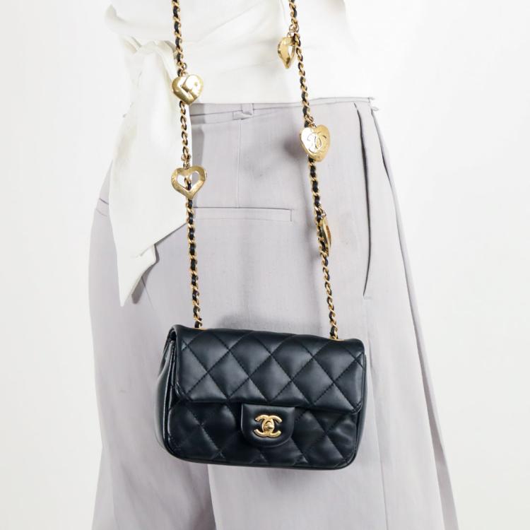 Chanel mini rectangular single flap bag in black diamond-quilted lambskin leather. Featuring antique-gold hardware, exterior rear pocket, a gold chain-leather threaded shoulder strap with heart charms. The turn-lock closure and flap open to a black leather interior with a patch pocket. Approximate dimensions: 18cm(L) x 12cm(H) x 4cm(D), strap drop 59cm. With Entrupy Certificate of Authenticity. (Pre-owned)