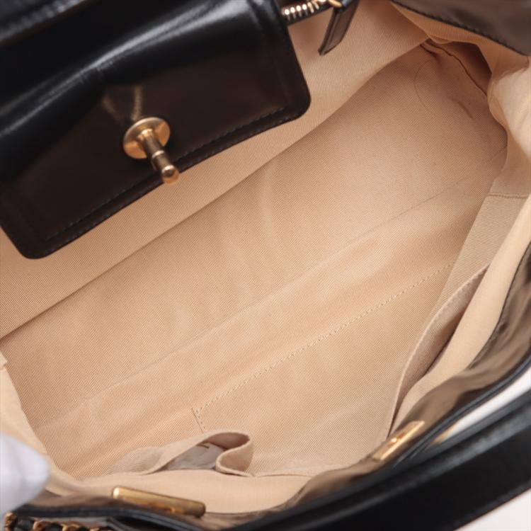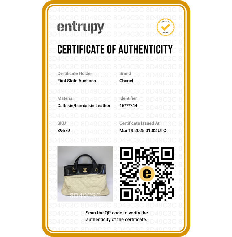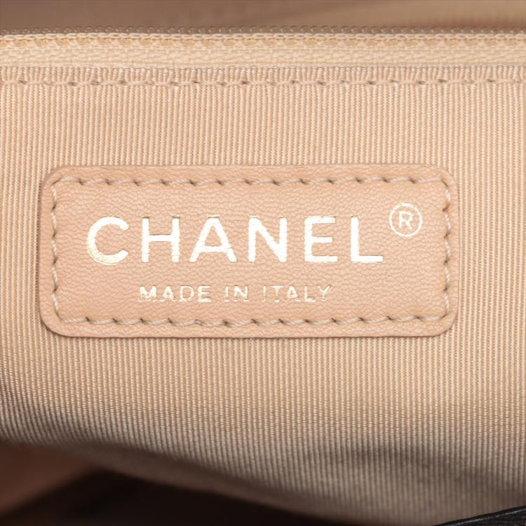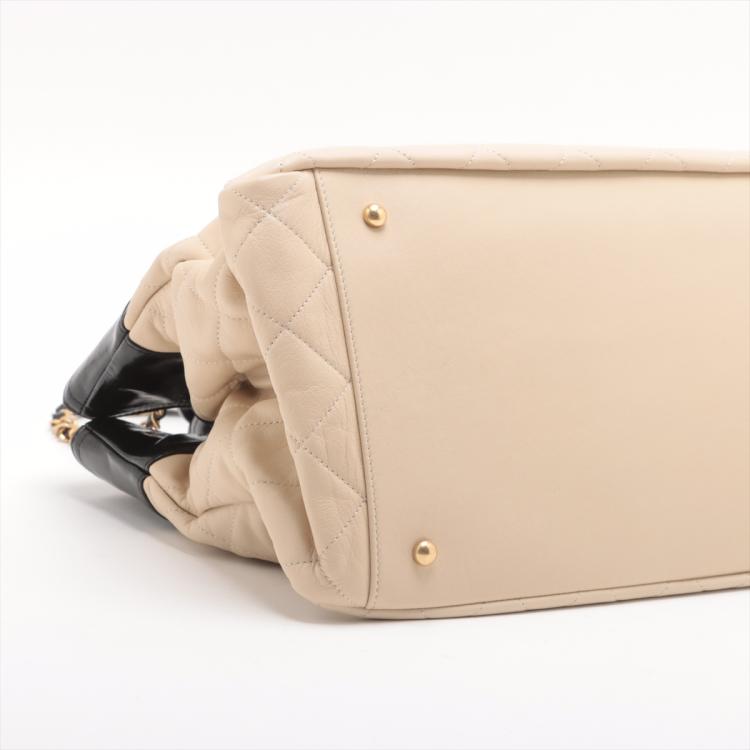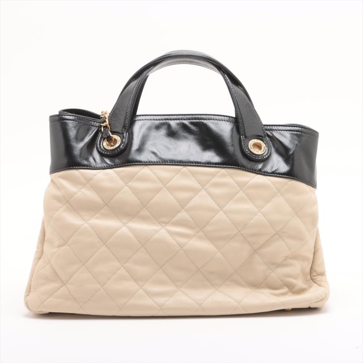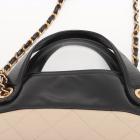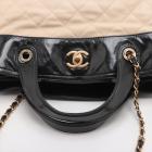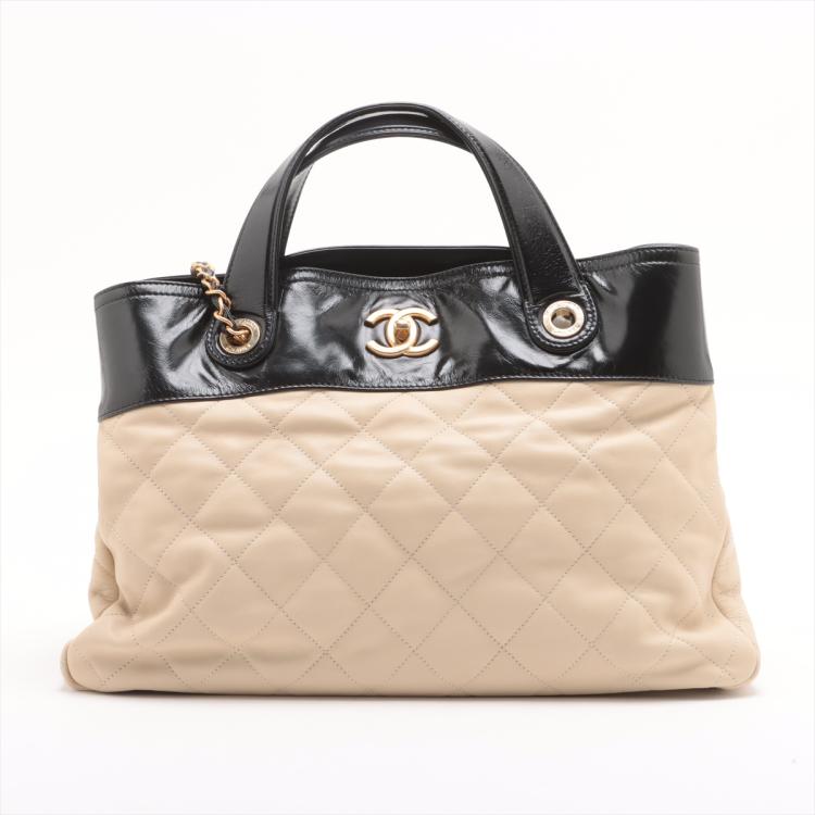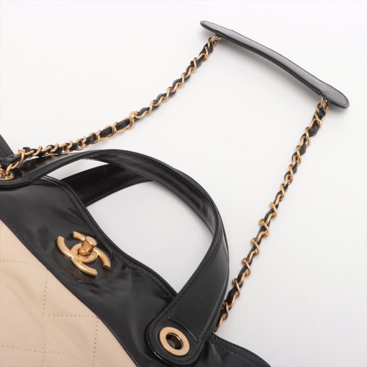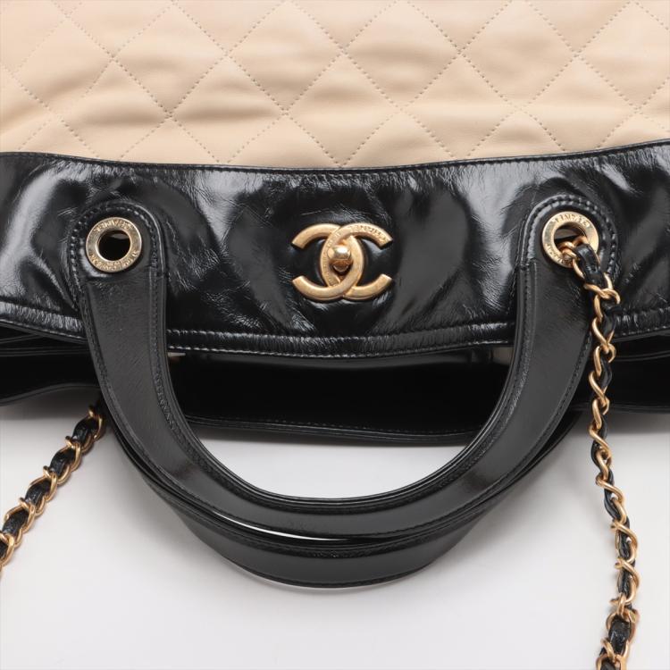 Chanel In The Mix tote in shiny black leather and beige diamond-quilted calfskin (16xxxxxx). Featuring antique gold toned hardware, leather handles, leather-chain straps, front CC turn-lock closure. This opens to beige textile interior with 2 compartments divided by a zipper pocket. Approx dimensions: 37cm(L) x 24cm(H) x 18cm(D), handle drop 9cm, shoulder straps drop 27cm. Accompanied by Chanel dustbag, certificate card. With Entrupy Certificate of Authenticity. (Pre-owned)