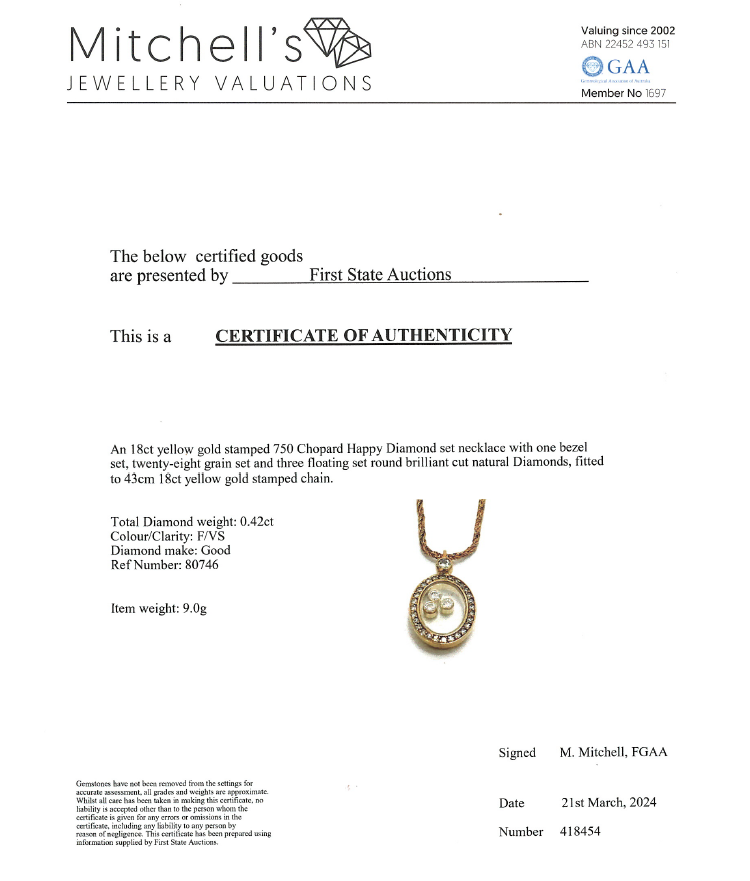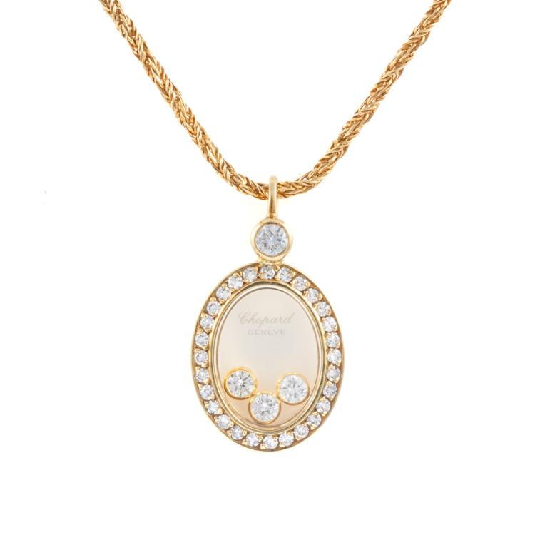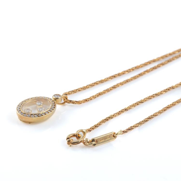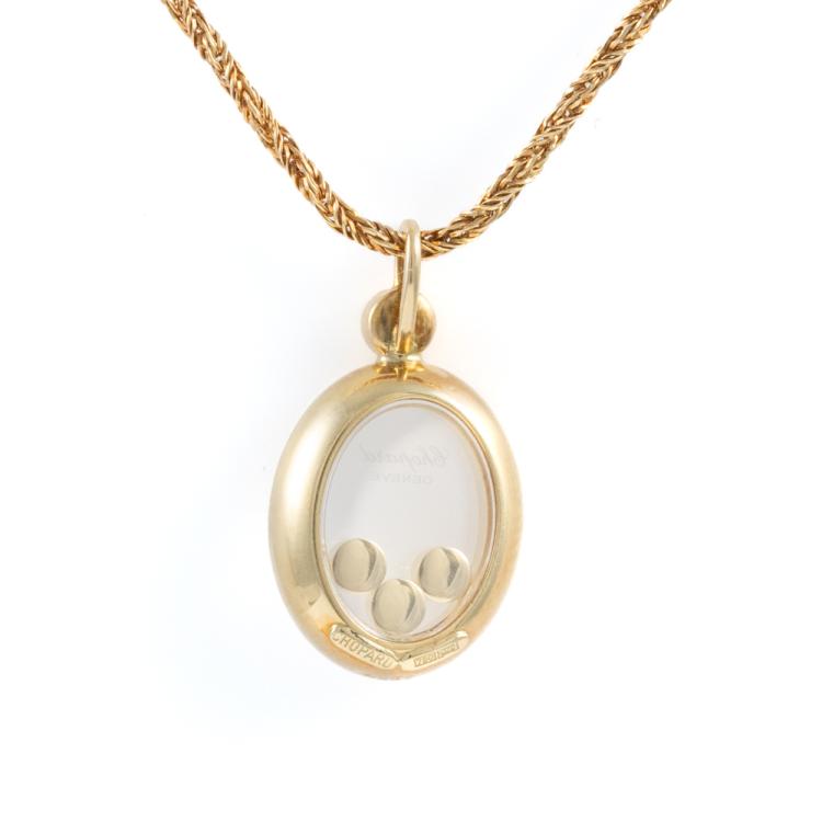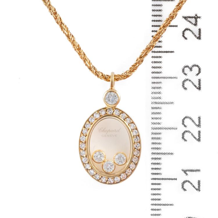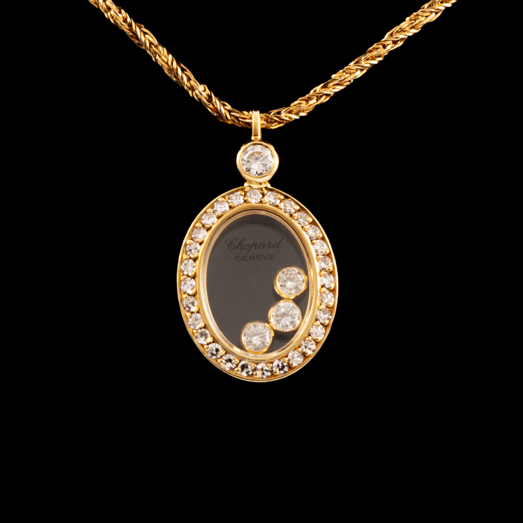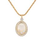Chopard Happy Diamond oval pendant with 3 floating and surrounding round Natural Diamonds totalling approximately 0.42cts (Estimated grading: F VS). 18ct yellow gold with 18ct yellow gold 43cm chain. Weight: 9.0g. With Certificate #418454. (Pre-owned)