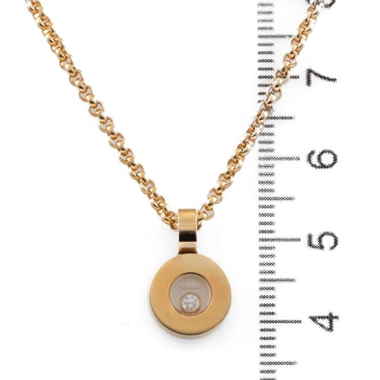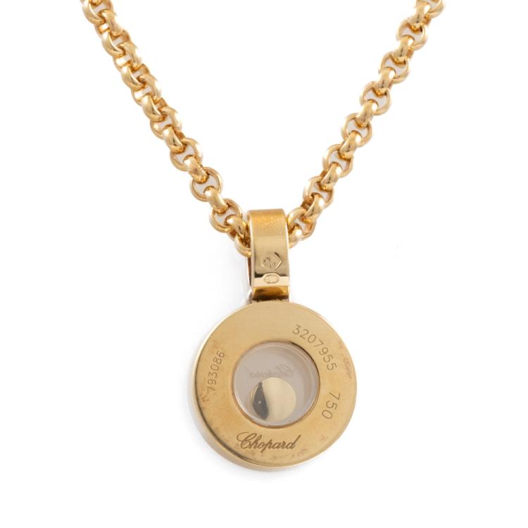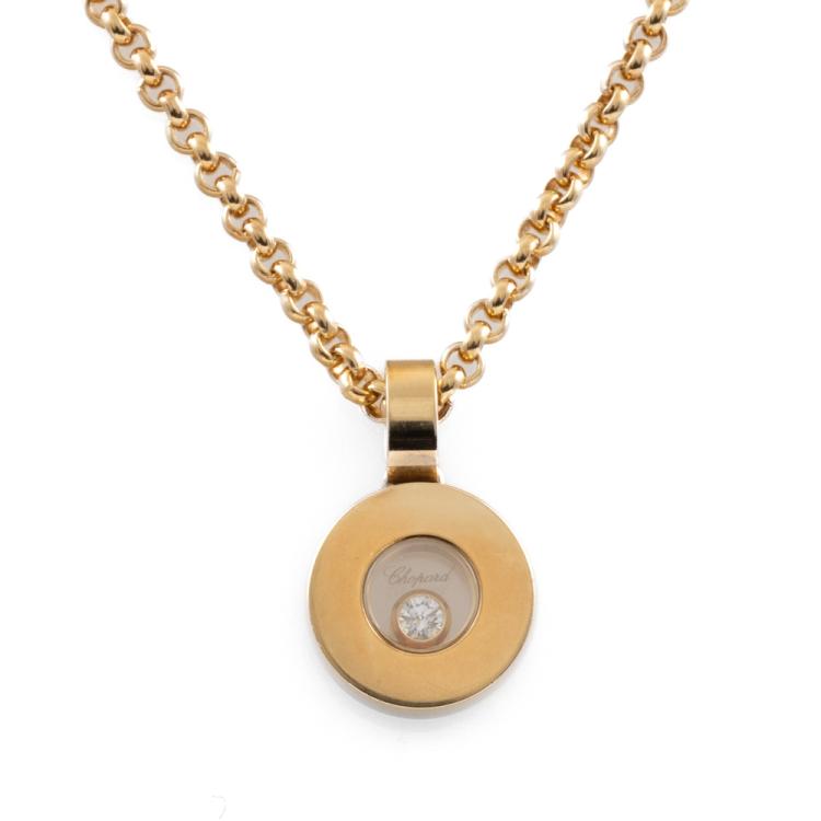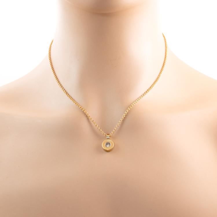 Chopard Happy Diamonds Icons pendant with one floating round Natural Diamond of 0.05ct. Pendant length: 15.5mm. 18ct yellow gold with 18ct yellow gold Chopard 42cm chain. Weight: 12.3g. (Pre-owned)
