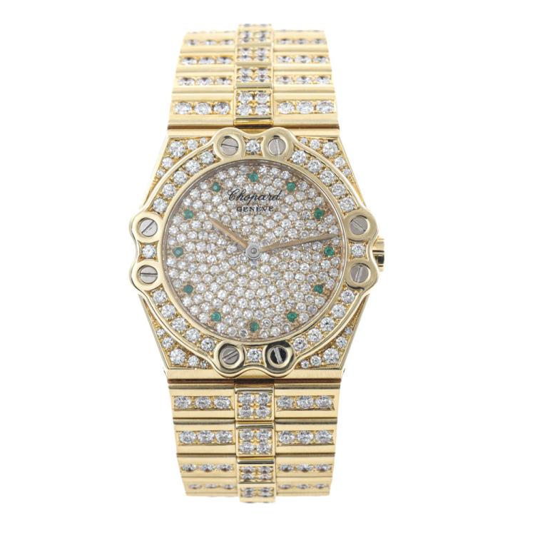 Chopard St Moritz 18ct yellow gold quartz ladies watch. Diamond set dial and bezel, Emerald indicators, case diameter: 32mm, wrist size: 17.5cm, Swiss made. Ref# 2171. With Chopard 18ct yellow gold Diamond set bracelet and clasp. Diamonds totalling approximately 10.00ct. Weight 152g. With Certificate of Authenticity. 3 month FSA warranty. (Pre-owned)