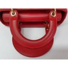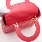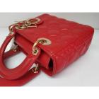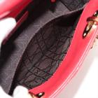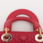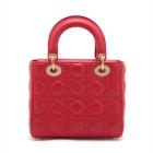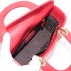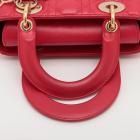 Christian Dior small My Lady ABCDior bag in red lambskin with Cannage stitching. Featuring gold-toned hardware, including Dior letter charms. The brown logo printed fabric interior covered by a leather flap, containing patch and zipper pockets. Approximate dimensions: 20cm(L) x 18cm(H) x 8.5cm(D), 8.5 handle drop, 56cm detachable strap with 3 badges drop. With Entrupy Certificate of Authenticity. (Pre-owned)