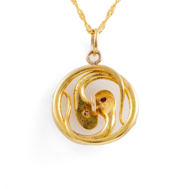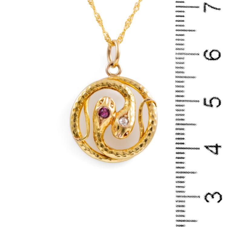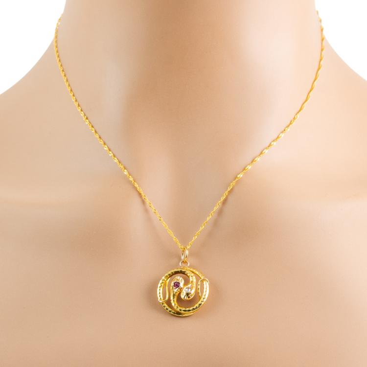 Double snake pendant with round natural Ruby of approximately 0.03ct and round natural Diamond of approximately 0.03ct. 18ct yellow gold with 41cm 18ct yellow gold chain. Weight: 5.4g (Pre-owned)