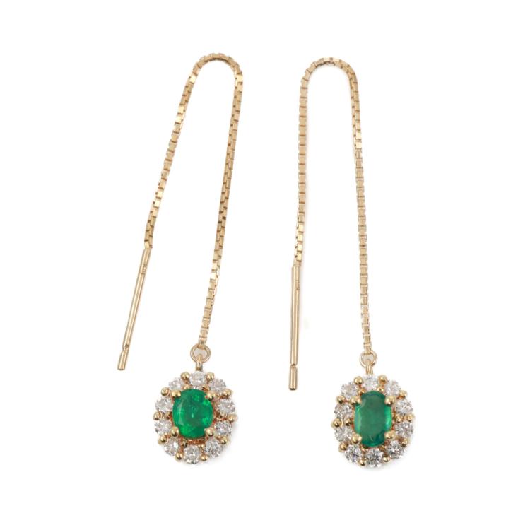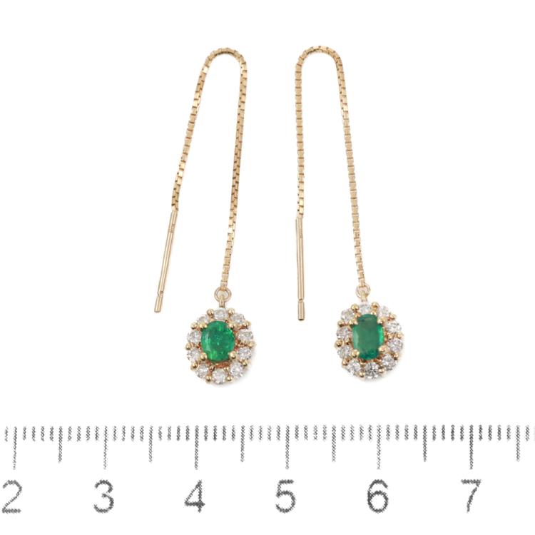 Emerald and Diamond threader earrings with oval shape Natural Emeralds totalling approximately 0.40ct and round Natural Diamonds totalling approximately 0.40ct (Estimated grading: I-J SI). 18ct yellow gold. Weight: 2.8g. (Pre-owned)