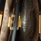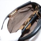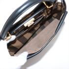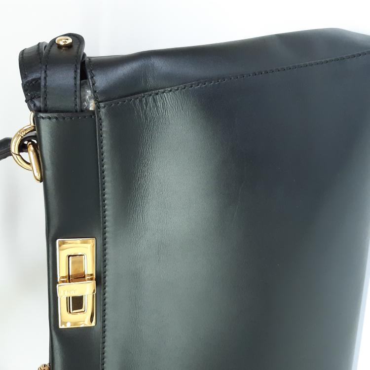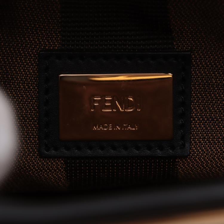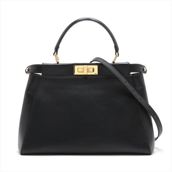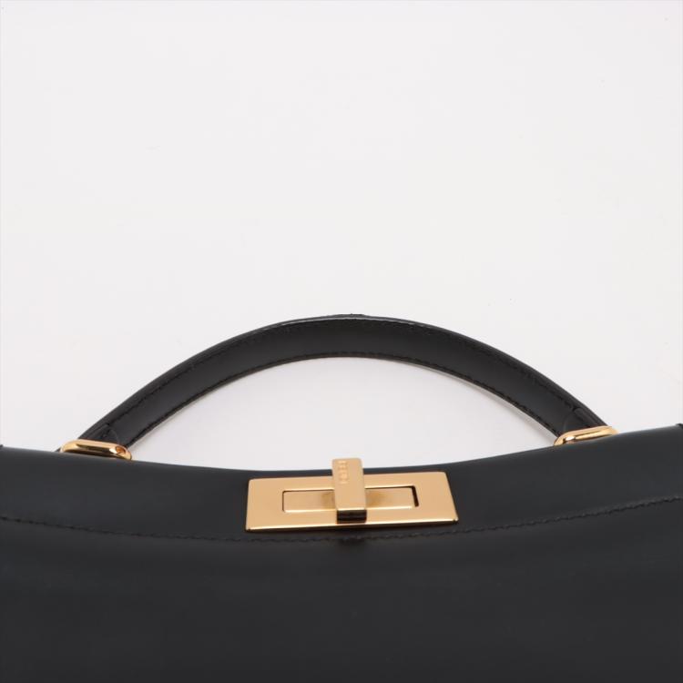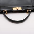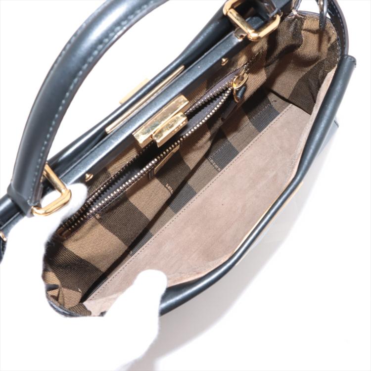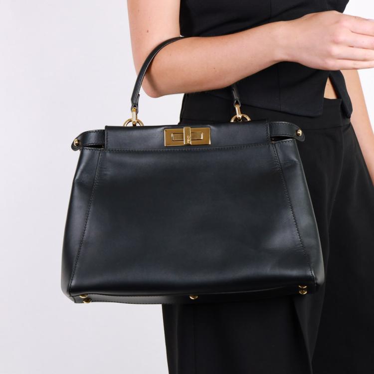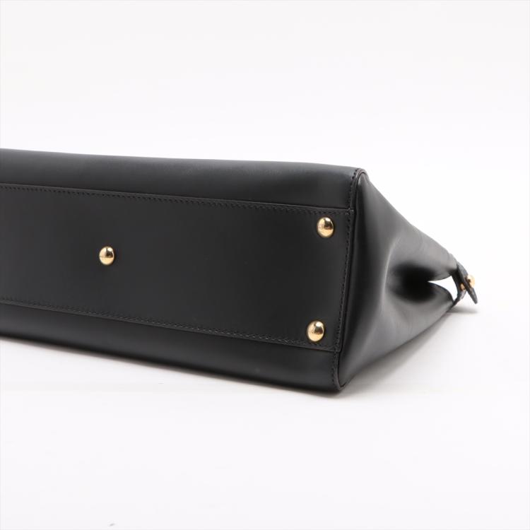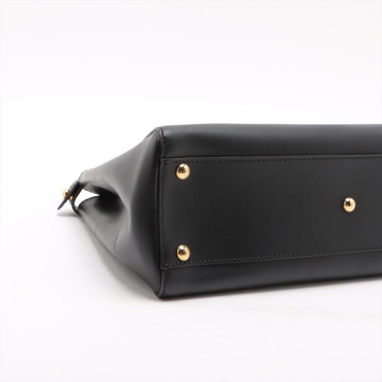 Fendi regular Selleria Peekaboo 2way bag in black smooth leather. Featuring gold-tone hardware, single brown leather handle, turn-lock closures at front and back. The top opens to two compartments lined in strip pattern fabric and suede with a zipped pockets. Approximate dimensions: 34cm(Base-L) x 24cm(H) x 14cm(D), handle drop: 12cm, strap drop: 54cm adjustable. Accompanied by a Fendi dust bag. With Entrupy Certificate of Authenticity. (Pre-owned)