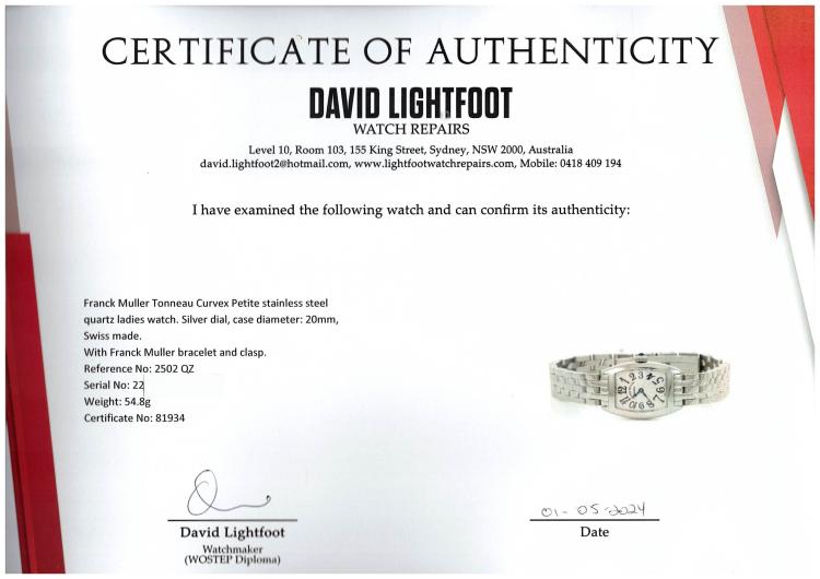 Franck Muller Tonneau Curvex Petite stainless steel quartz ladies watch. Silver dial, case diameter: 20mm, wrist size: 17cm, Swiss made. Ref# 2502 QZ. With Franck Muller bracelet and clasp. With Certificate of Authenticity and Franck Muller box. 3 month FSA warranty (Pre-owned).