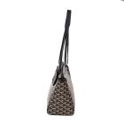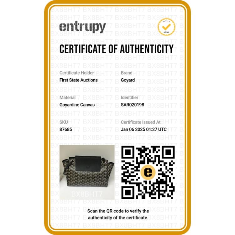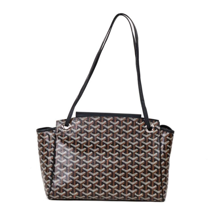 Goyard Rouette PM tote in Goyardine coated canvas and with black calfskin leather trim. Featuring silver-tone hardware, sliding leather shoulder straps. The crossover flap opens to a spacious beige canvas interior with a hanging patch pocket and a removable hard base board. Approximate dimensions: 31cm(Base-W) x 21cm(H) x 13.5cm(D), 27cm shoulder drop. Accompanied by Goyard dust bag. With Entrupy Certificate of Authenticity. (Pre-owned)