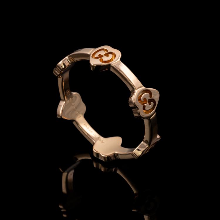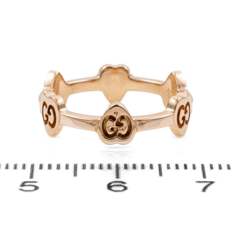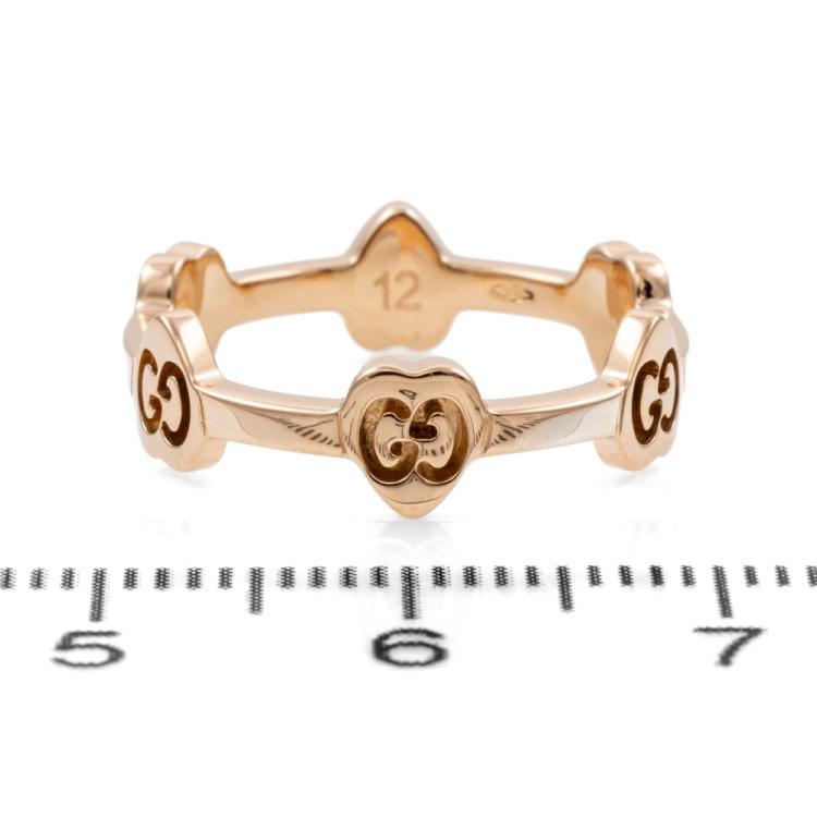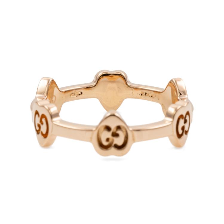 Gucci G Icon Heart station ring. 18ct rose gold. Stamped size 12, L- ring resizing is not recommended. Minimum band width: 2mm. Weight: 3.0g. (Pre-owned)